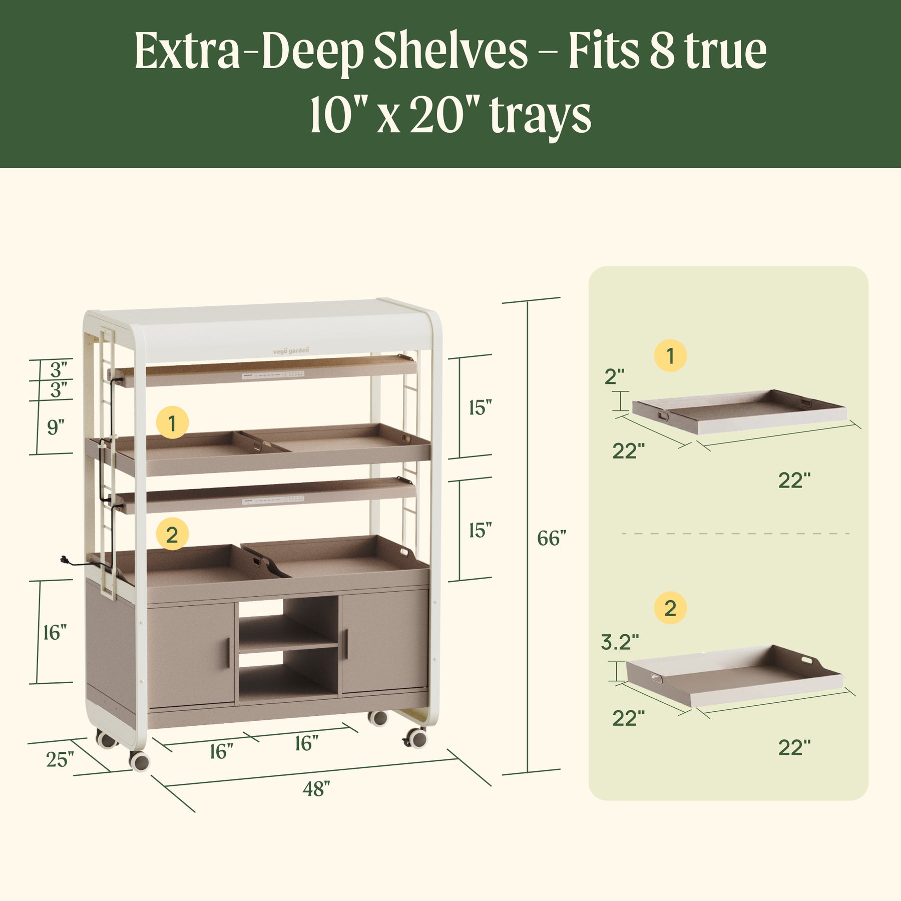 Yes. Each tray measures 22 x 22 inches and fits dual standard 10 x 20-inch seedling trays . It also has built-in water stops to prevent leakage and support self-watering pots.