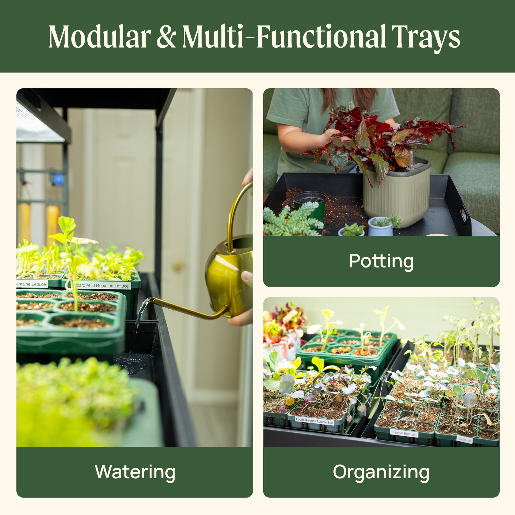 Leak-proof, removable trays catch water neatly and double as portable potting trays—keeping your indoor