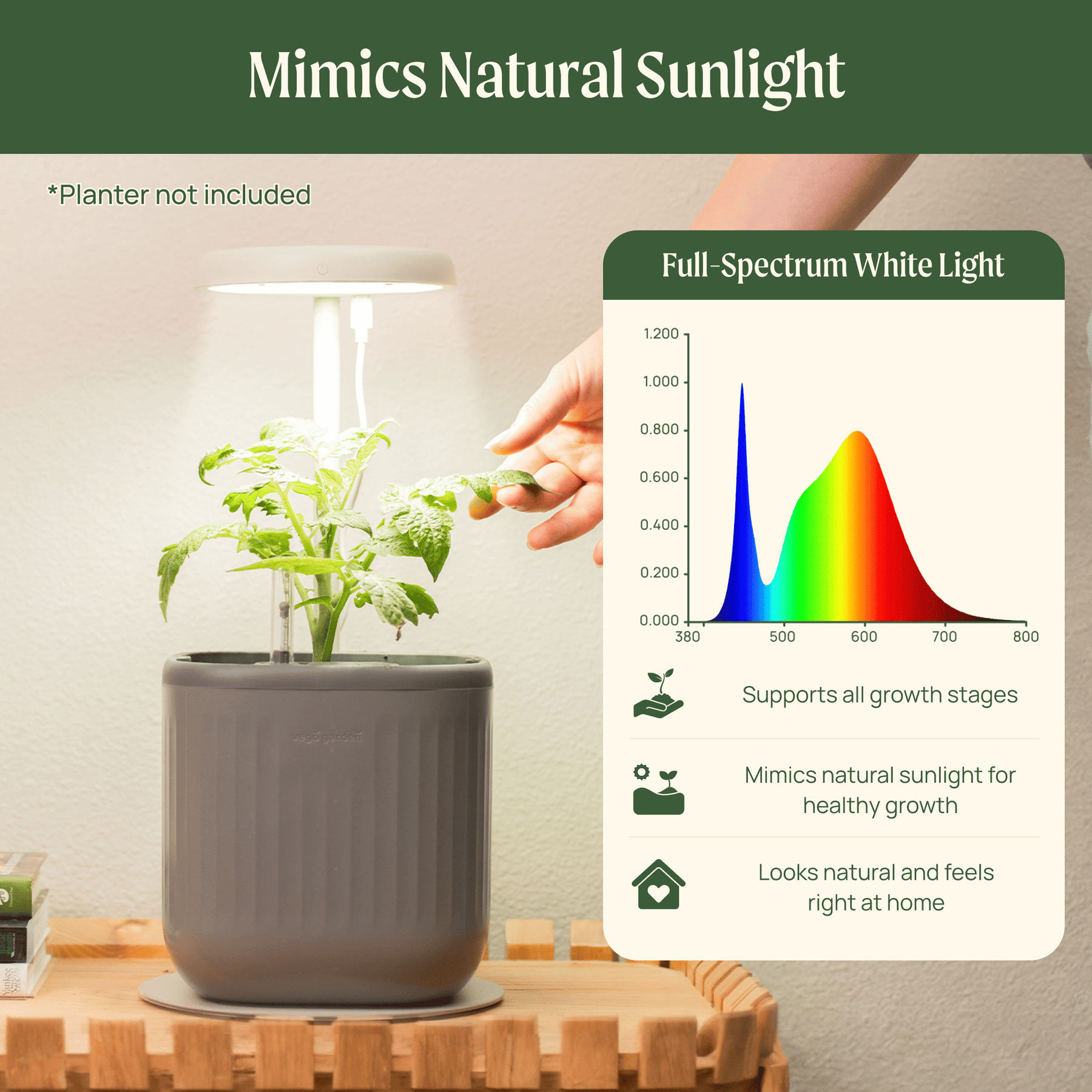 Full-spectrum white LED light supports all plant stages with a homey aesthetic.
