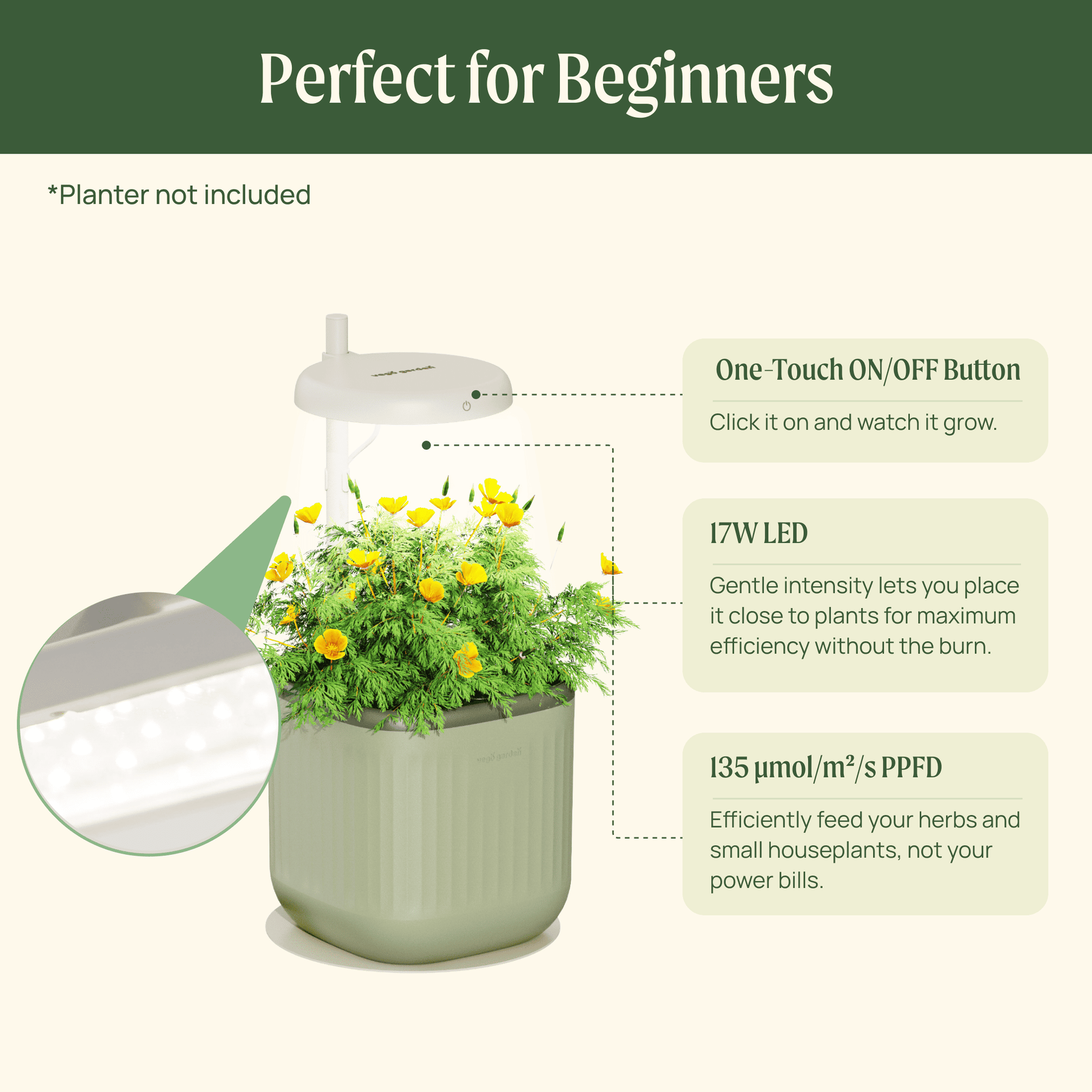 A single on/off function makes indoor gardening approachable for anyone.