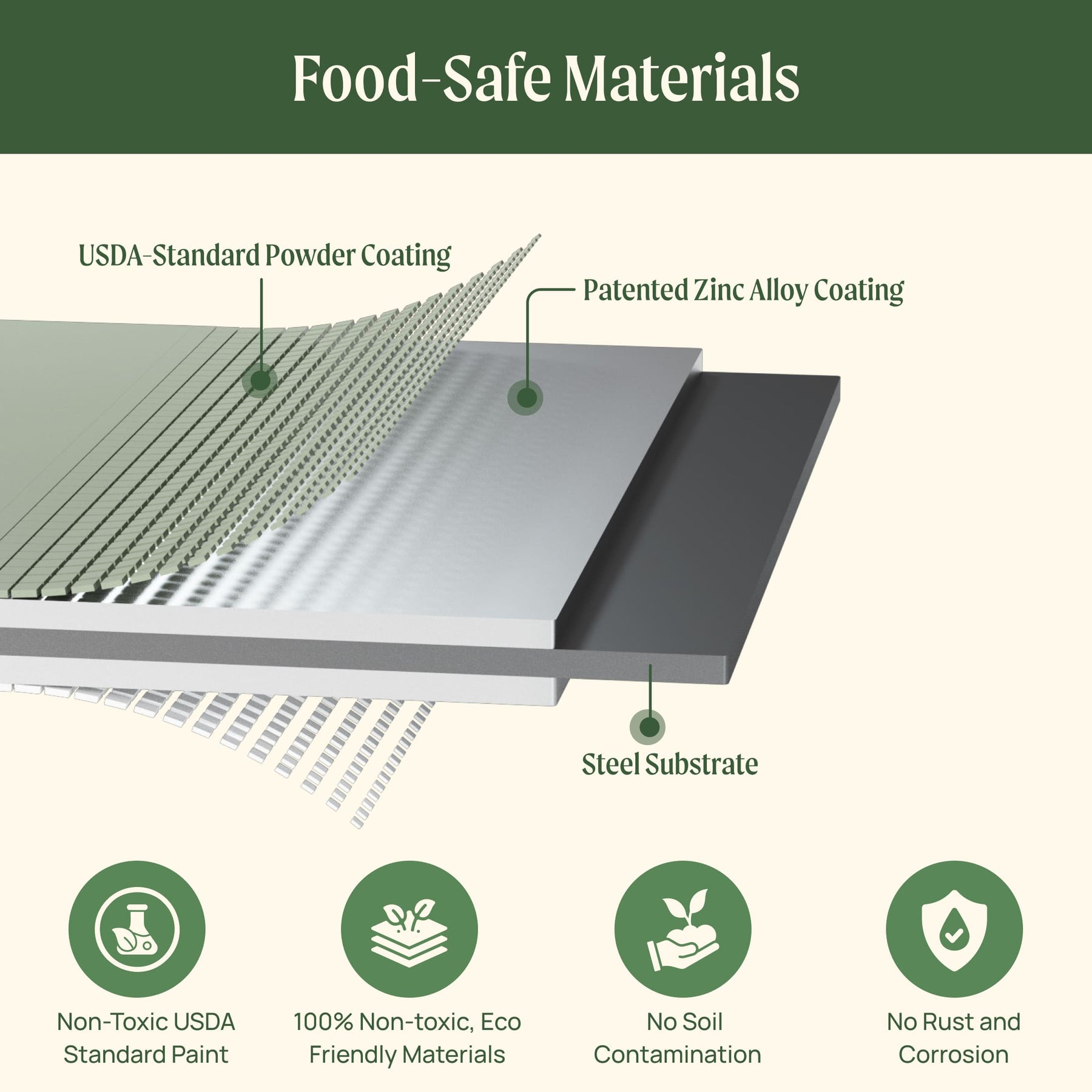 Our material, VZ 2.0, combines galvanized steel patented zinc alloy coating for strength and Akzo Nobel's USDA-Standard powder to make garden beds so clean you could eat off of them. What better place to grow your veggies!