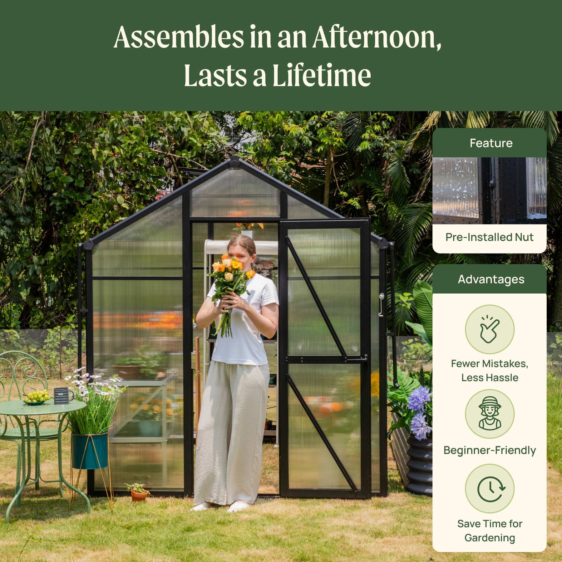 Don't waste a whole weekend building your greenhouse. Pre-installed nuts in the aluminum frame make assembly faster and easier—just align and rivet into place. With two people, full setup can be done in as little as 6 hours.