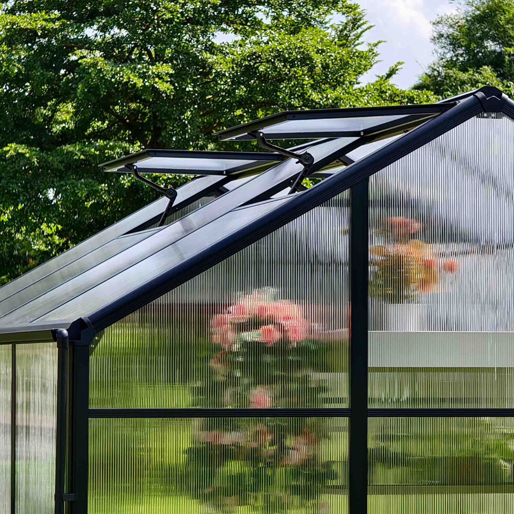 Features easy-to-open roof vents for simple, direct control over your greenhouse’s essential airflow