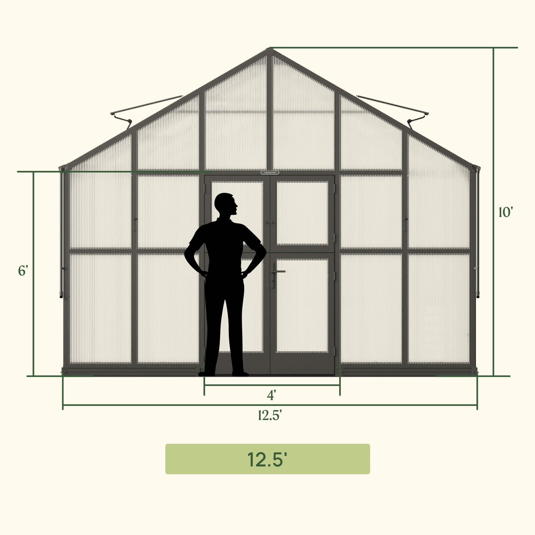 10 ft tall Victorian Greenhouse shape with double doors gives your plants more room to grow. A ground-level