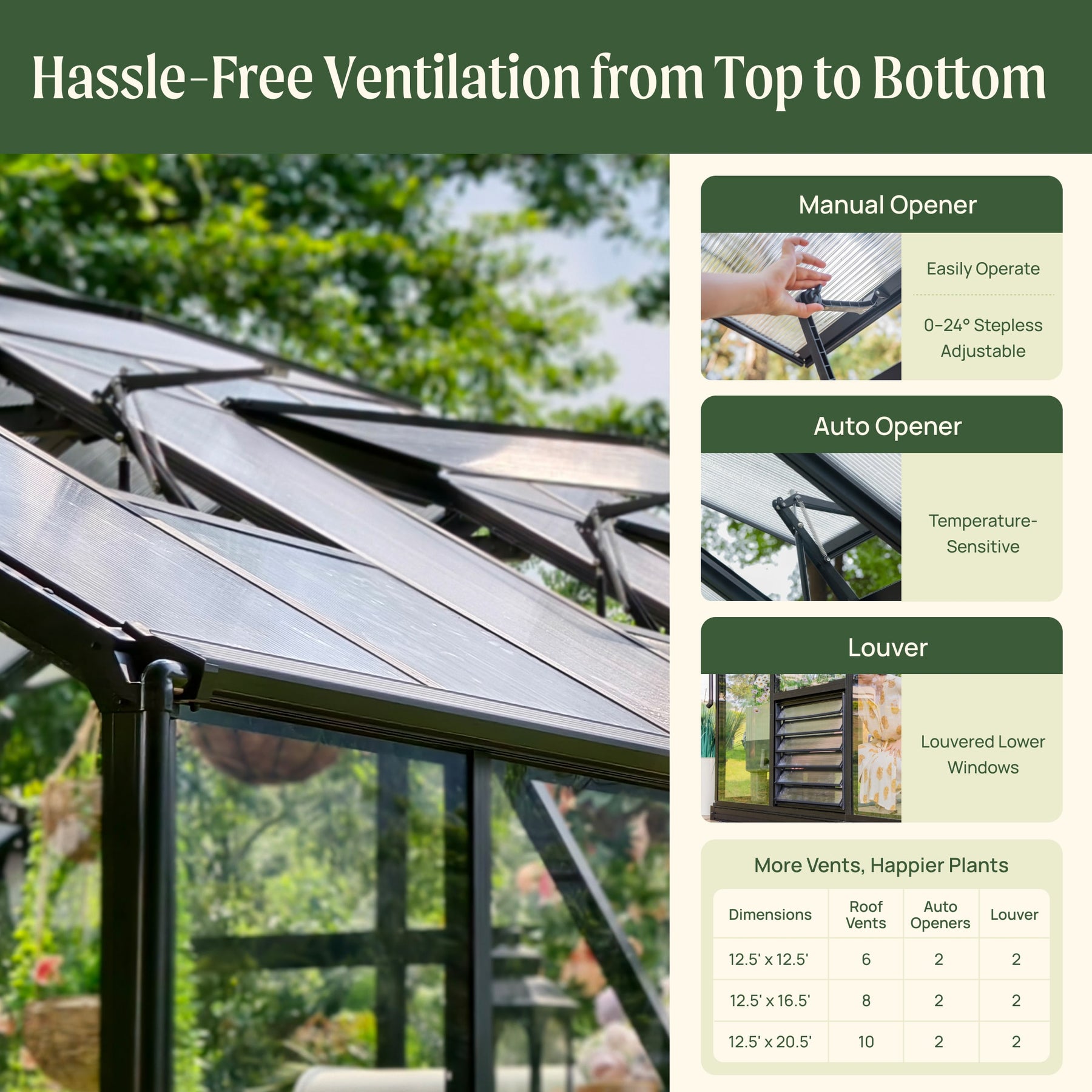 Easy-open roof vents and louvered lower windows complete a balanced airflow system that keeps plants