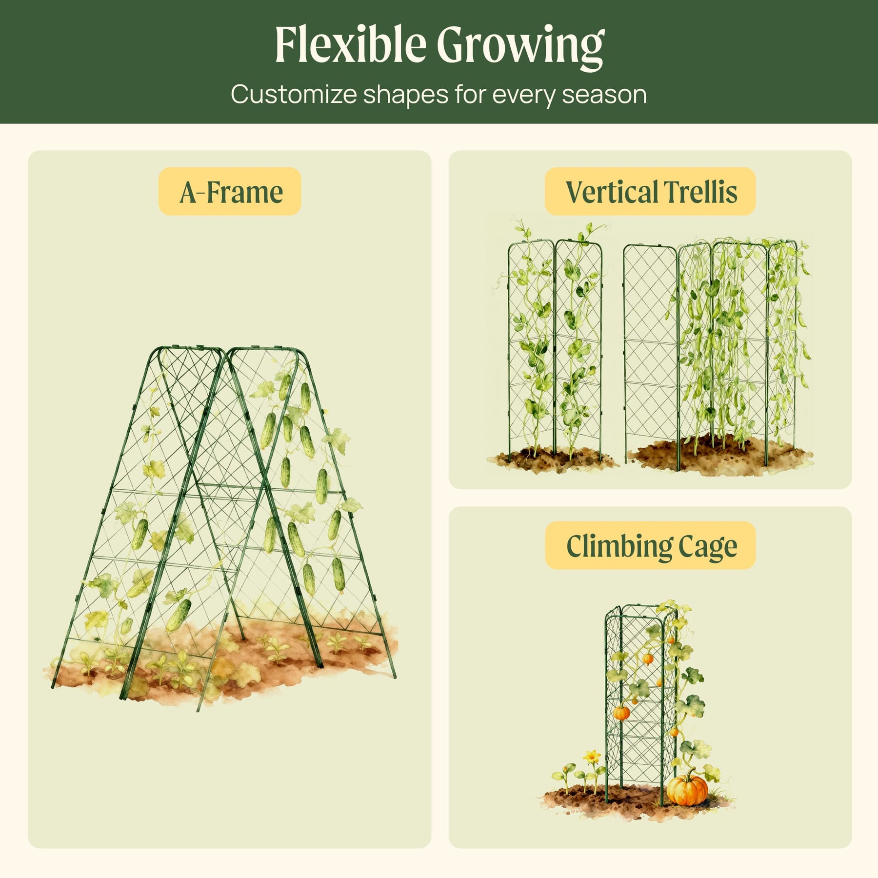 It supports heavier and more vigorous climbers such as indeterminate cucumbers, pole beans, peas, vining squash, and mixed plantings.