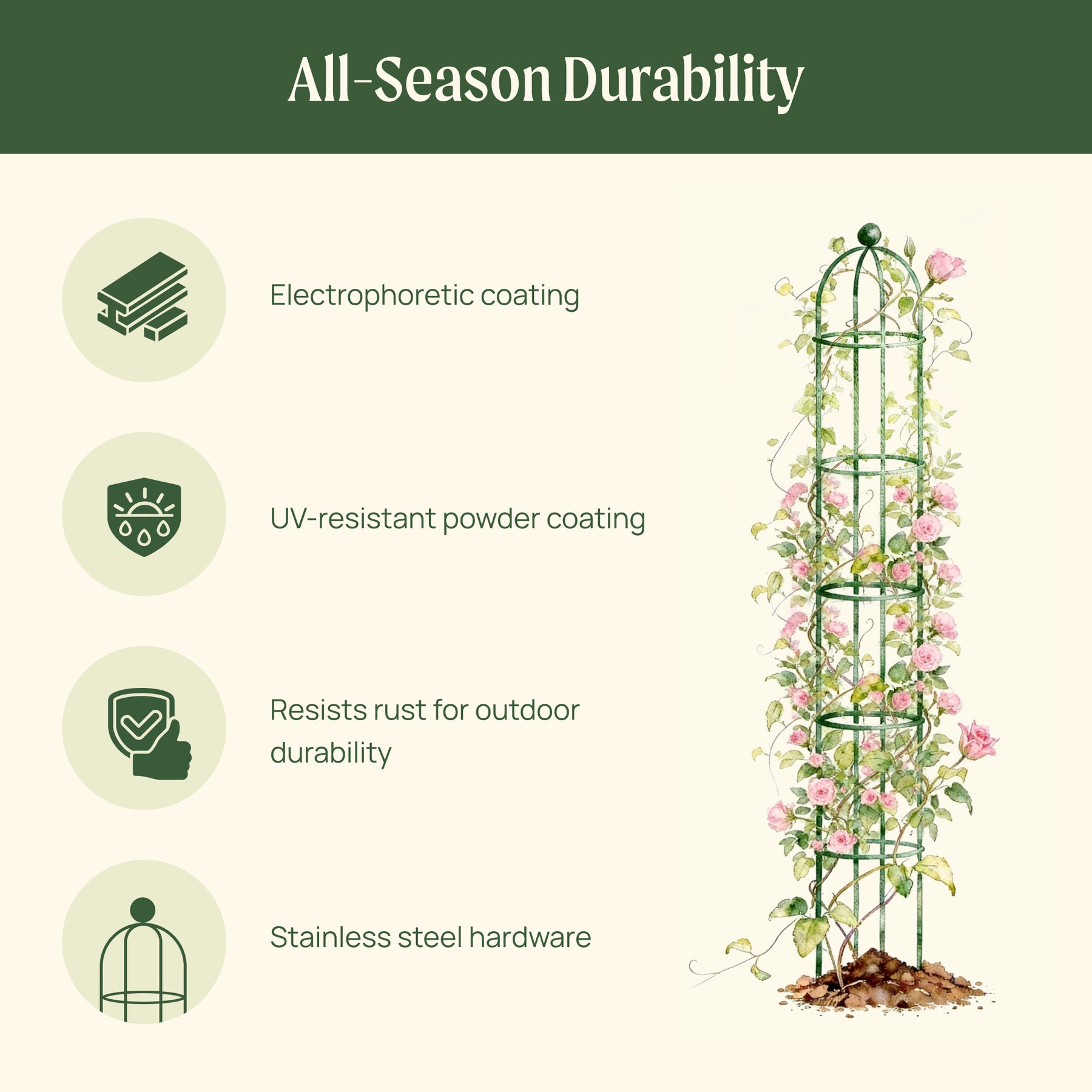 Dual protective coatings resist rust and weathering, so it stays strong and good-looking season after season.