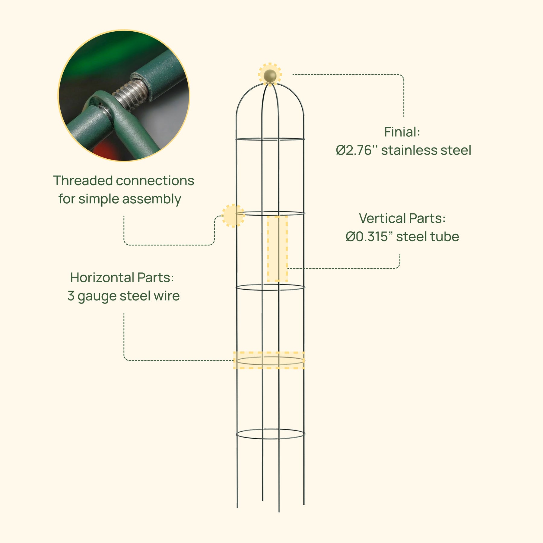 The Round Obelisk is a vertical plant support designed to guide climbing plants upward while serving as a decorative focal point in garden beds, raised beds, or planters.