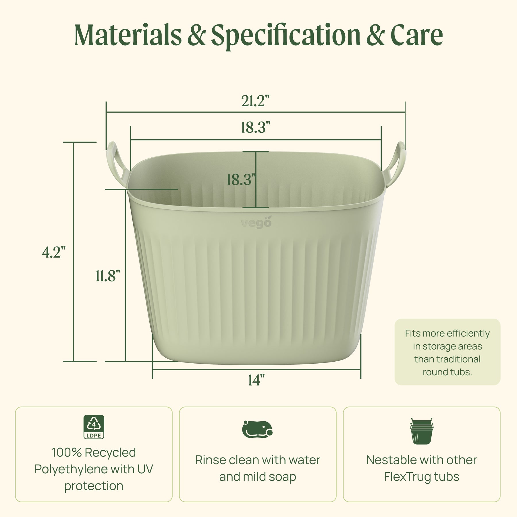 Fits more efficiently in storage areas than traditional round tubs, even at a larger size.