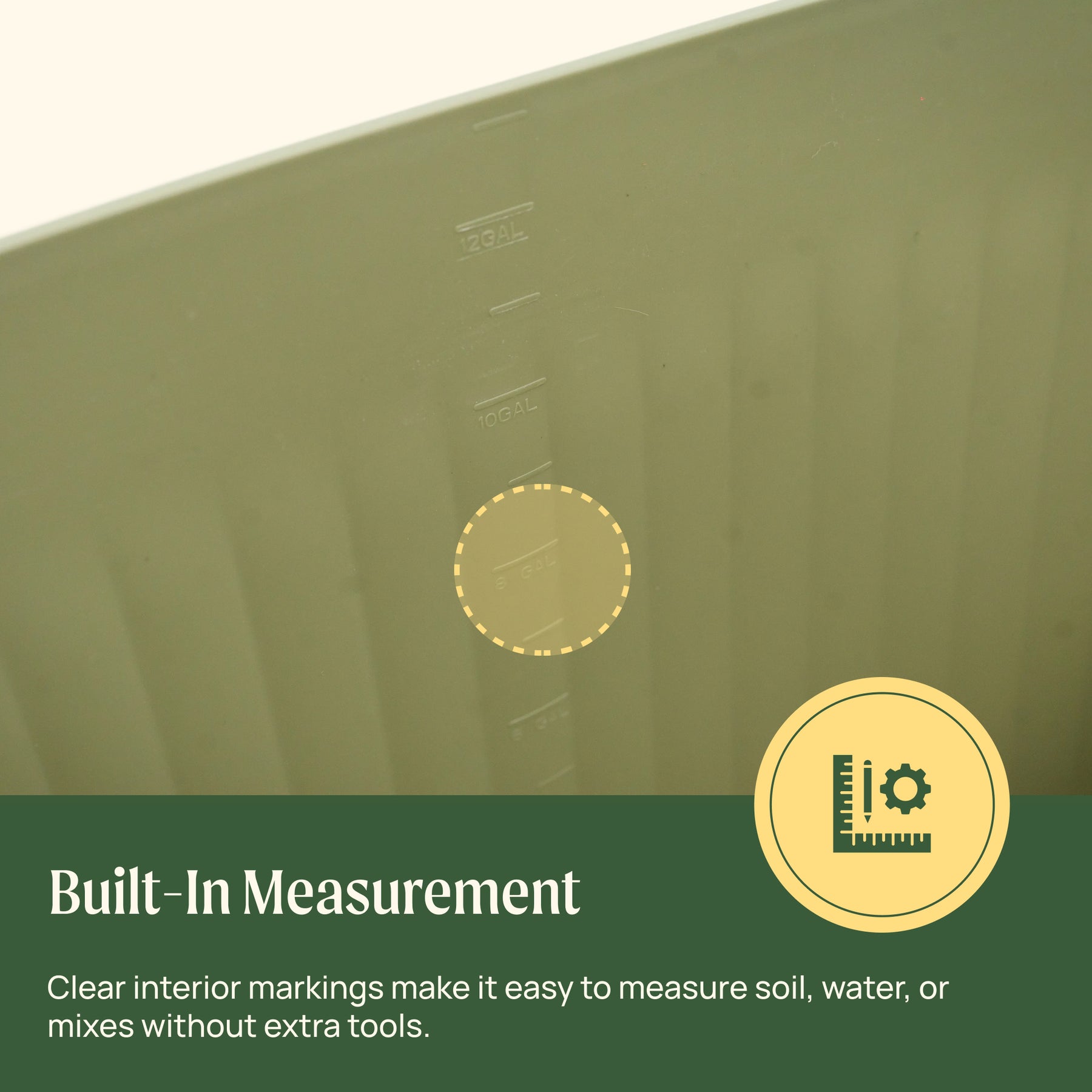 Integrated interior markings allow quick, practical measuring for soil, water, and mixes.
