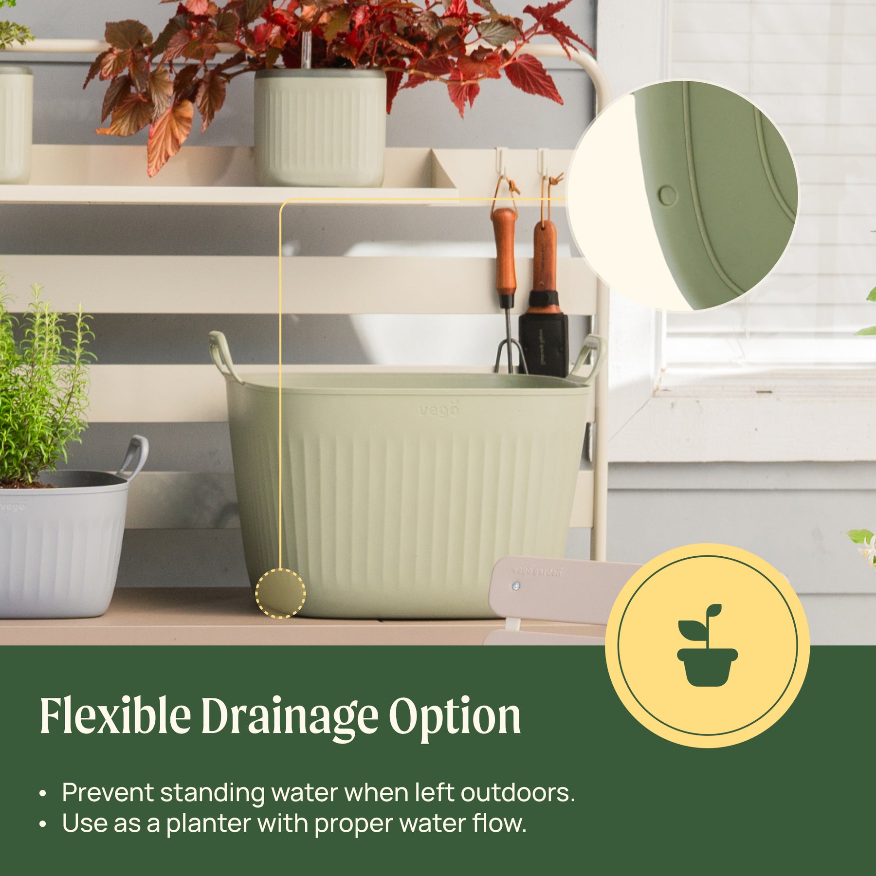 Subtle base markings show where to drill to add drainage, helping prevent standing water when left outdoors.