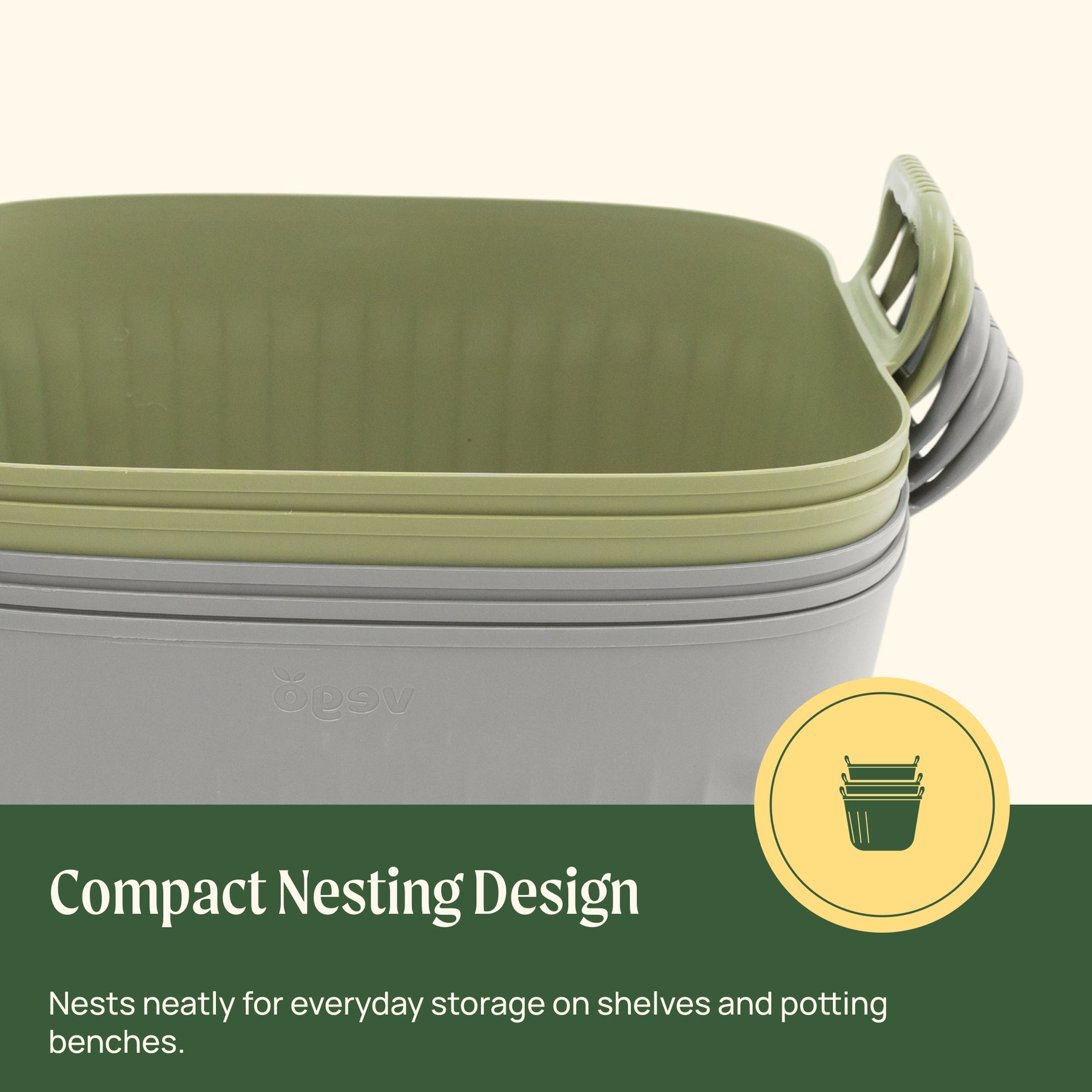 Nests neatly for everyday storage on shelves and potting benches.