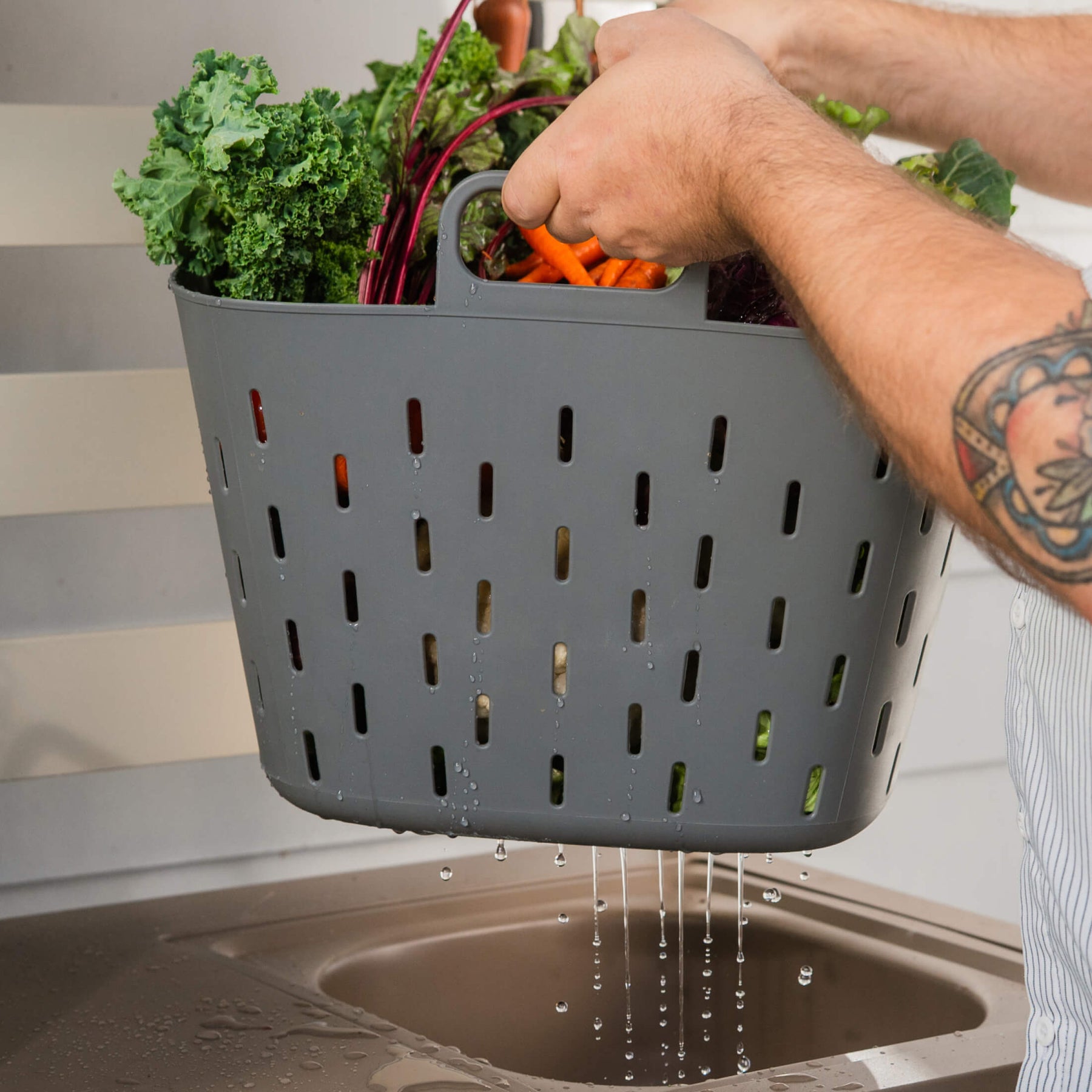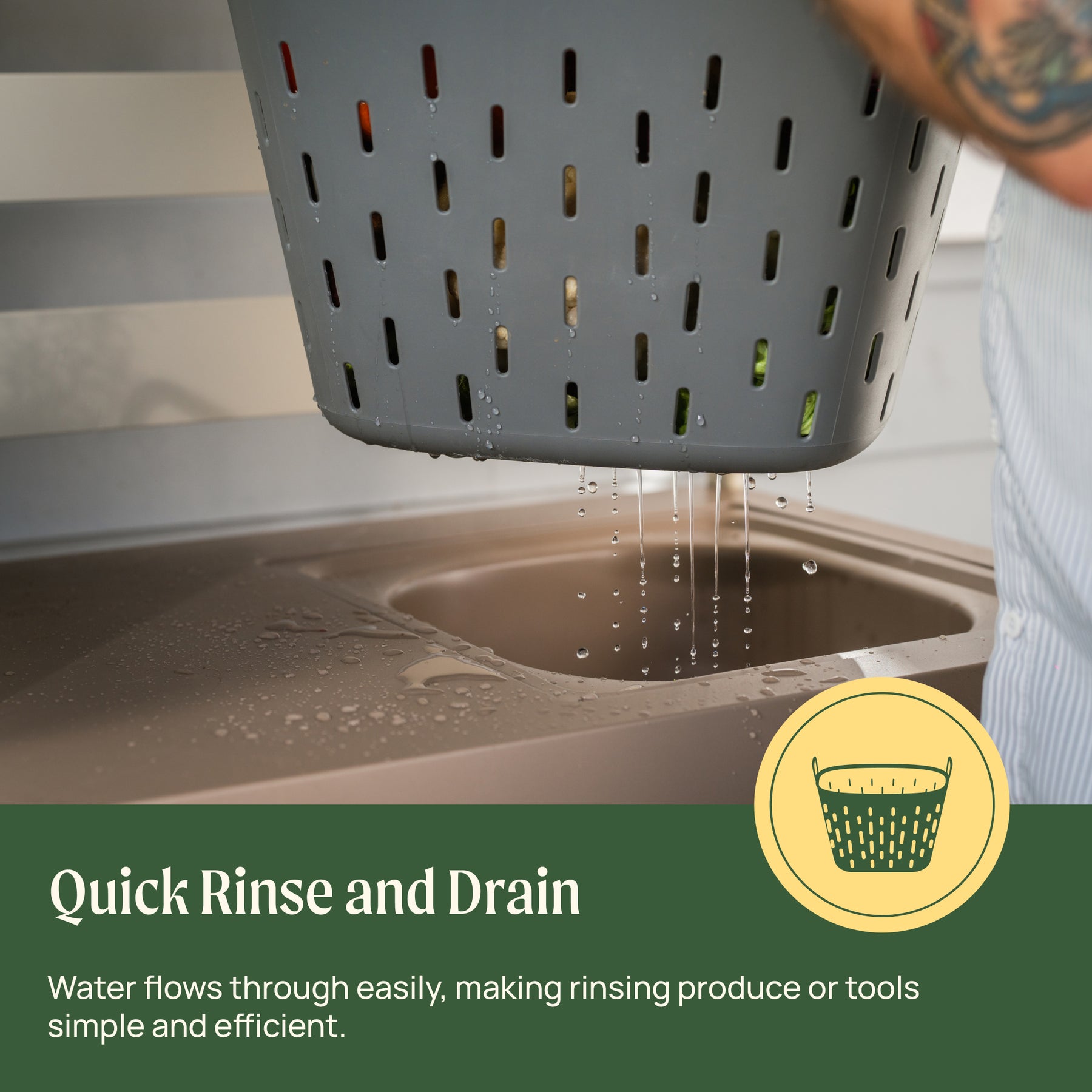 Wash produce or tools as water flows freely through the basket.