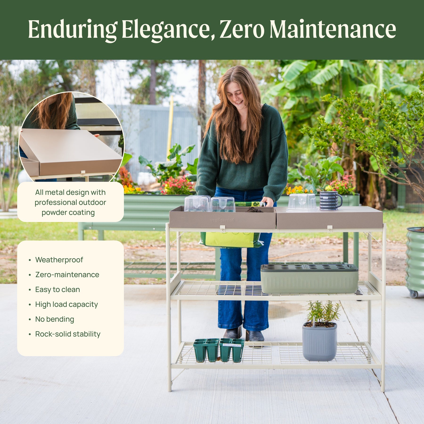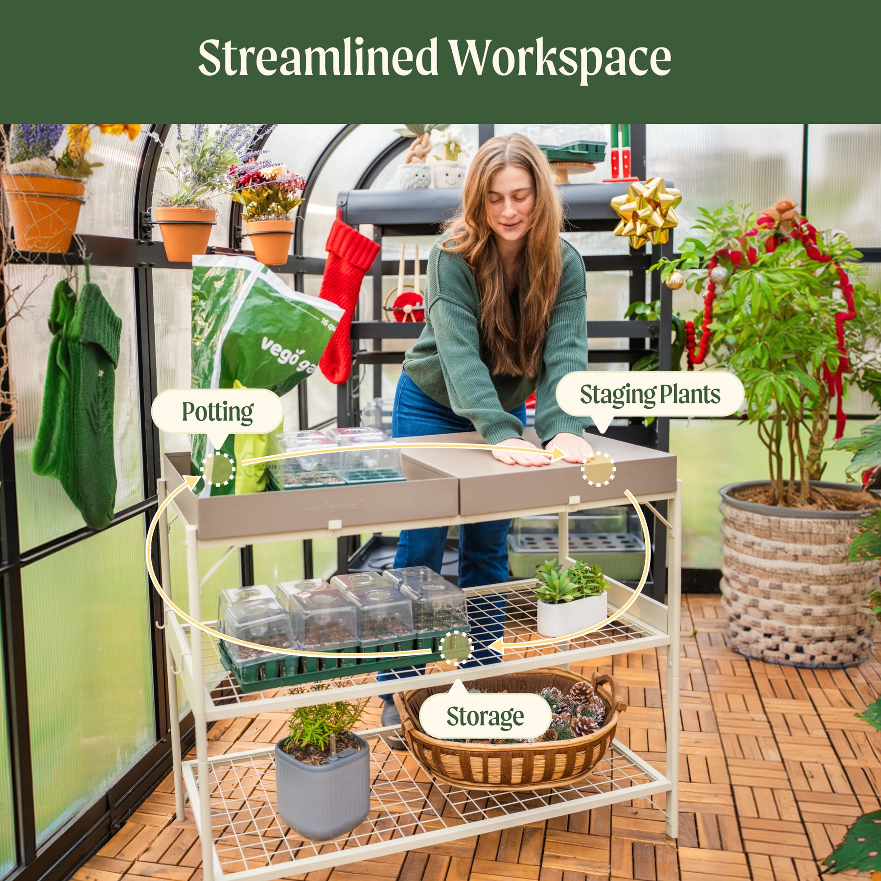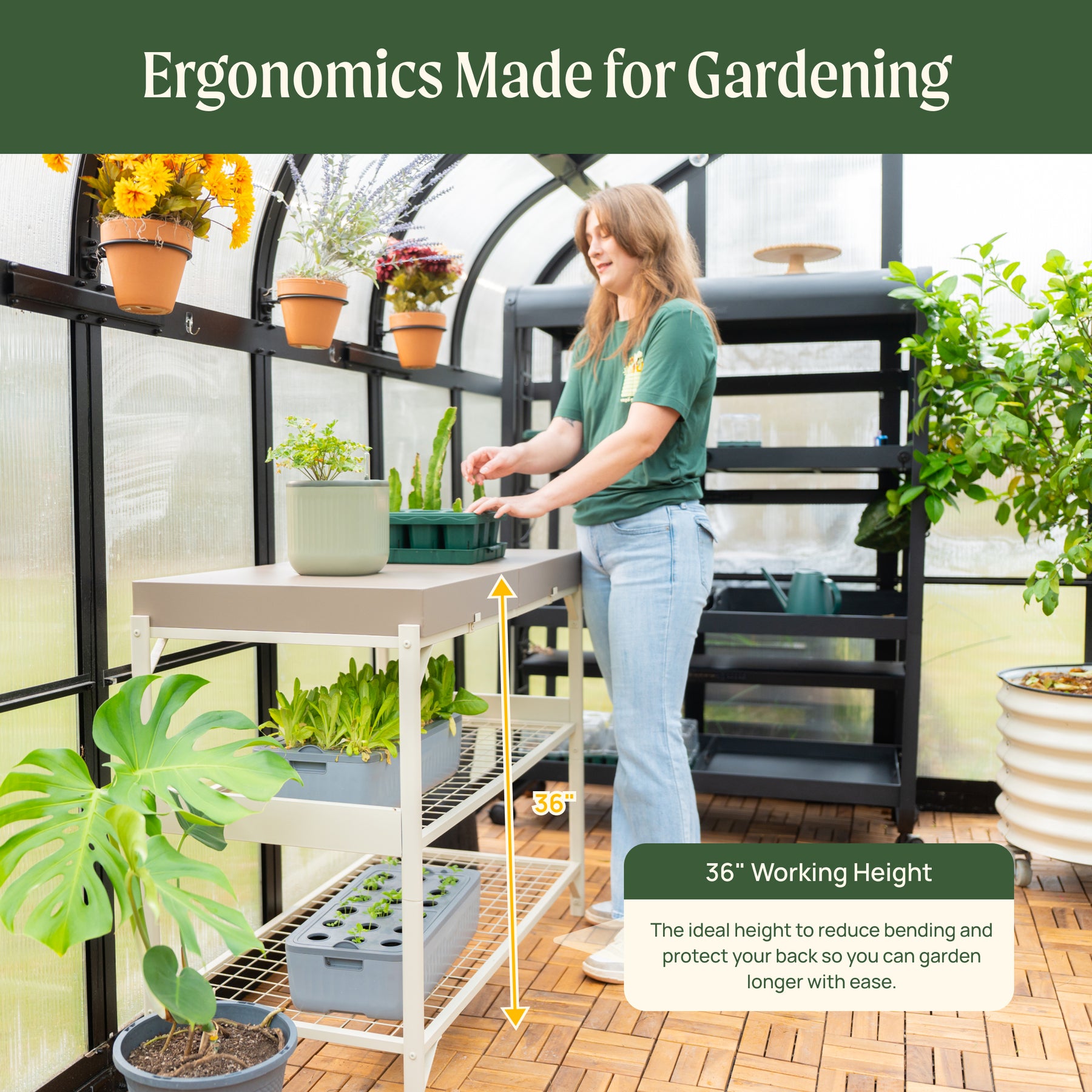 Dual reversible trays, tool-free adjustable storage, high load capacity, a maintenance-free metal build, and system compatibility make it more flexible, durable, and space-efficient than traditional potting tables.