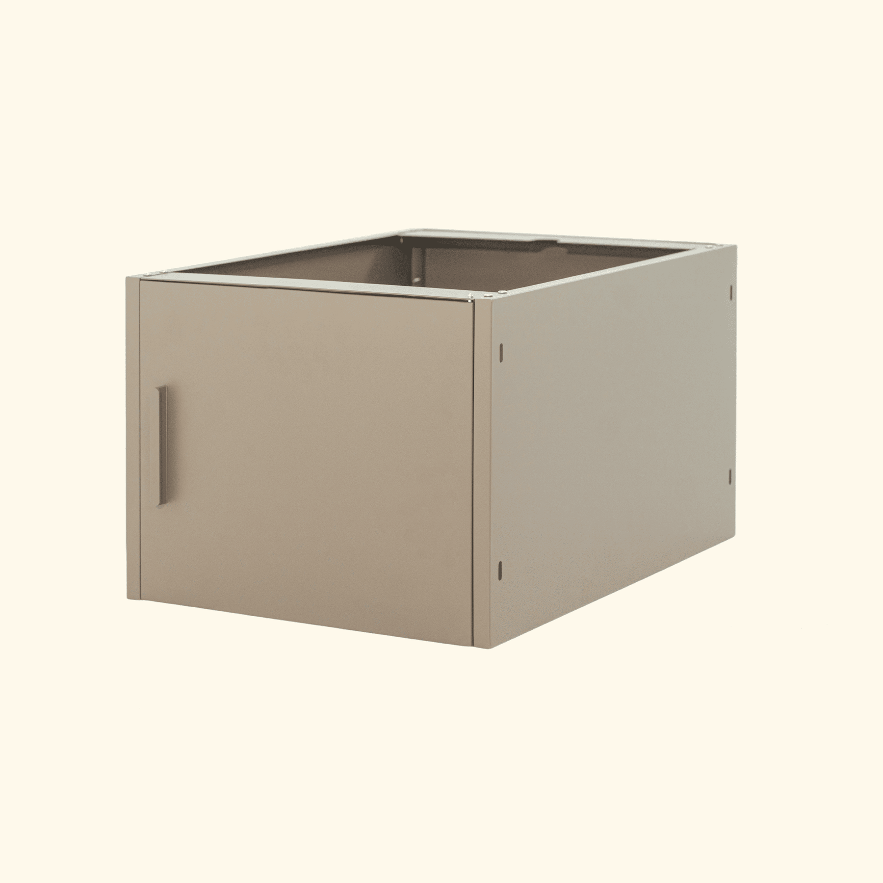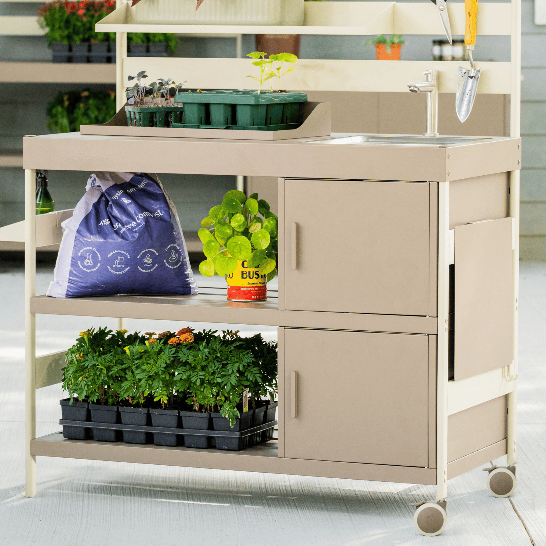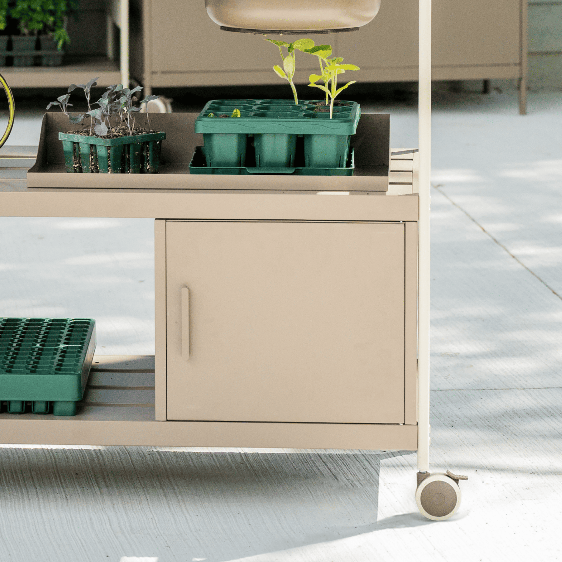The Add-On Cabinet is designed to fit perfectly with the Vego Potting Bench , Vego Potting Bench with Cabinet and Garden Sink Station , attaching securely to the bottom shelf on the wheel side.