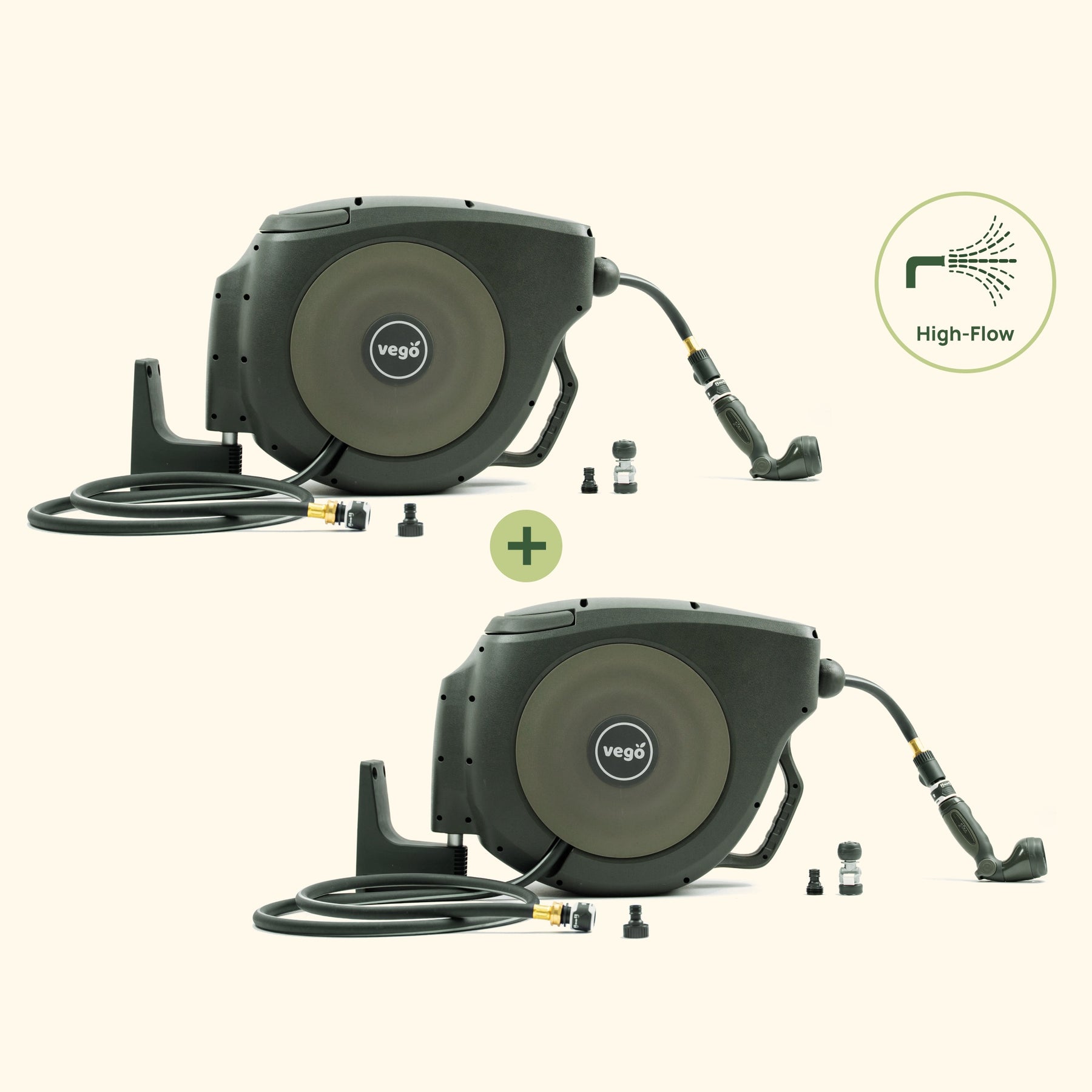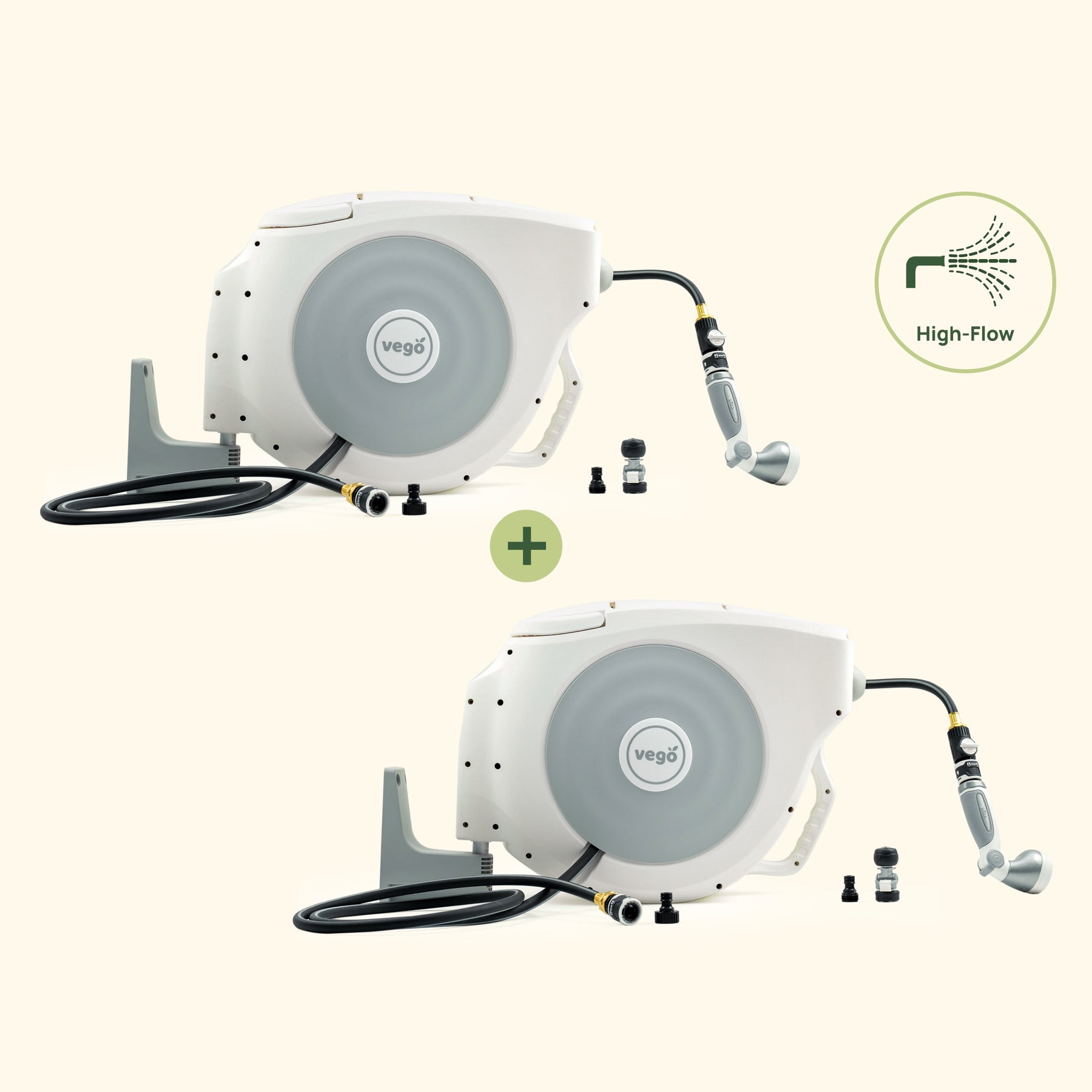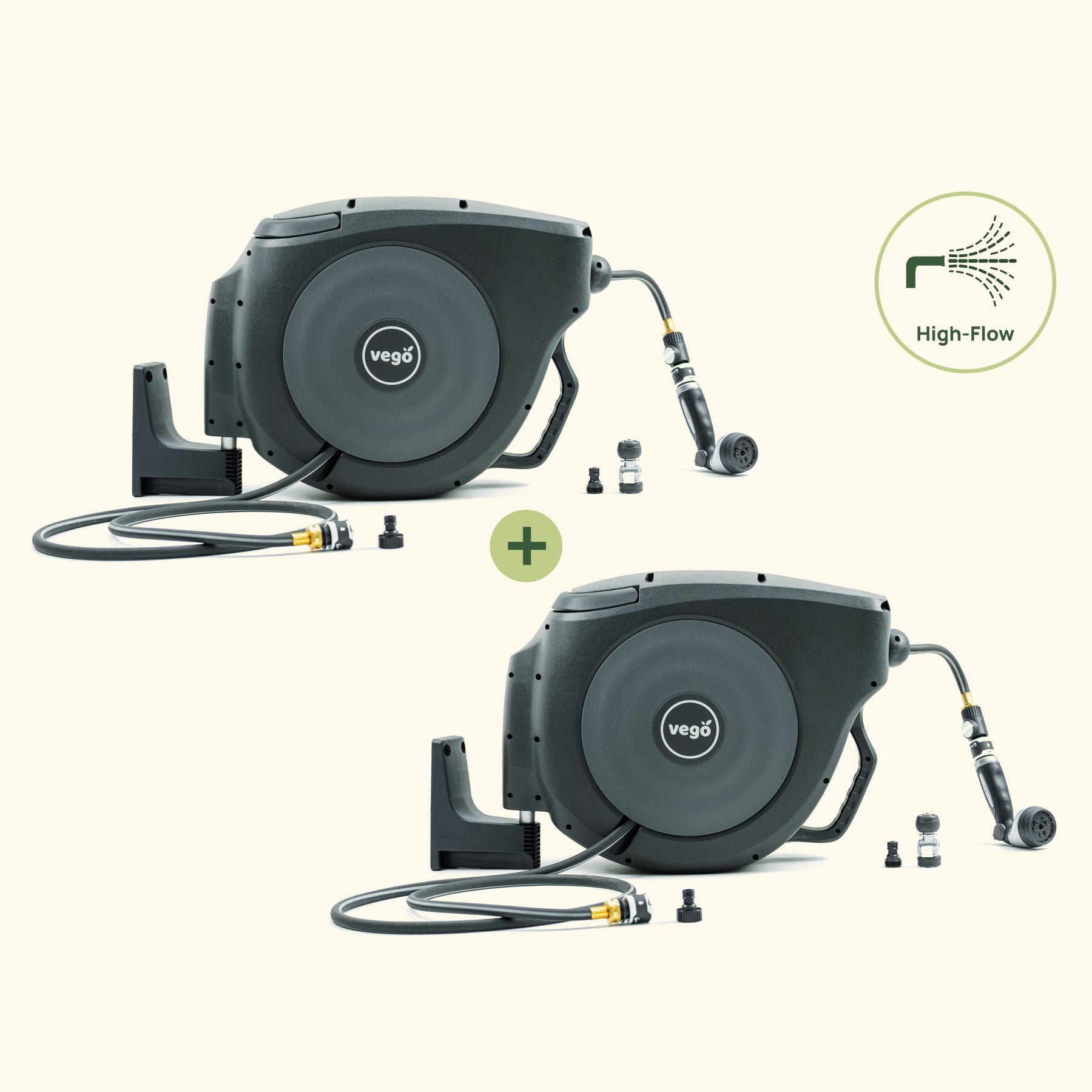 Get a double dose of our Hi-Flow Retractable Hose Reel Set, built to tackle all your watering needs. With steady, safe retraction, they are designed to conveniently store your hoses without clutter.