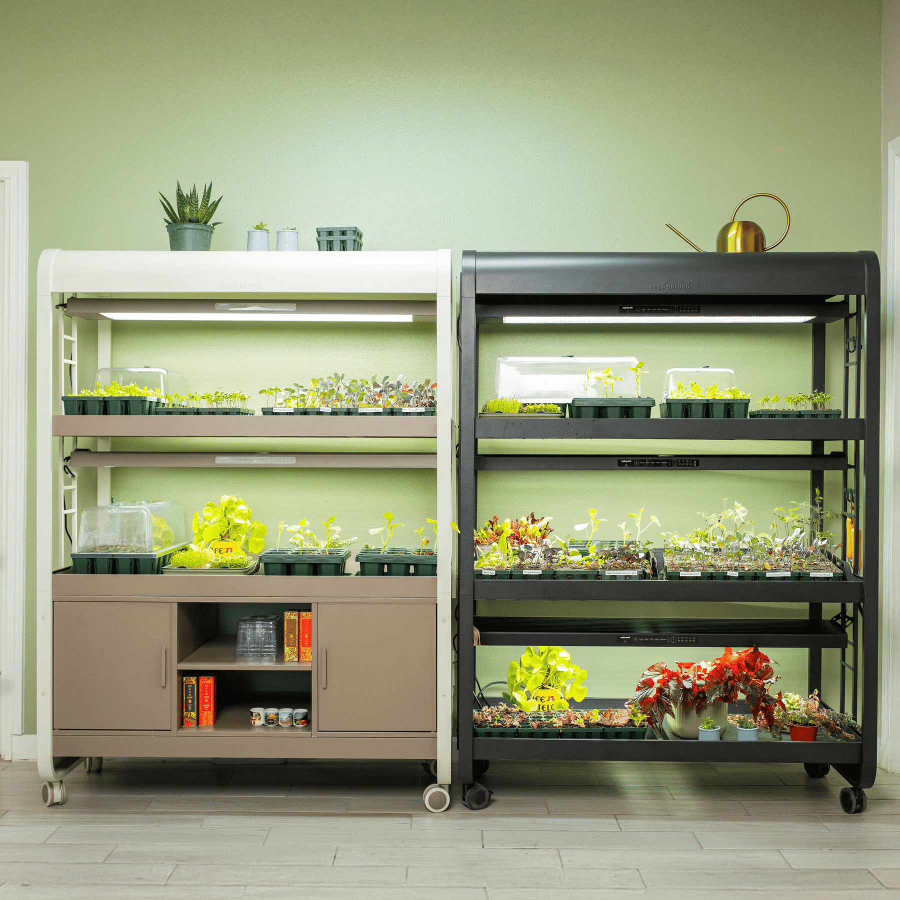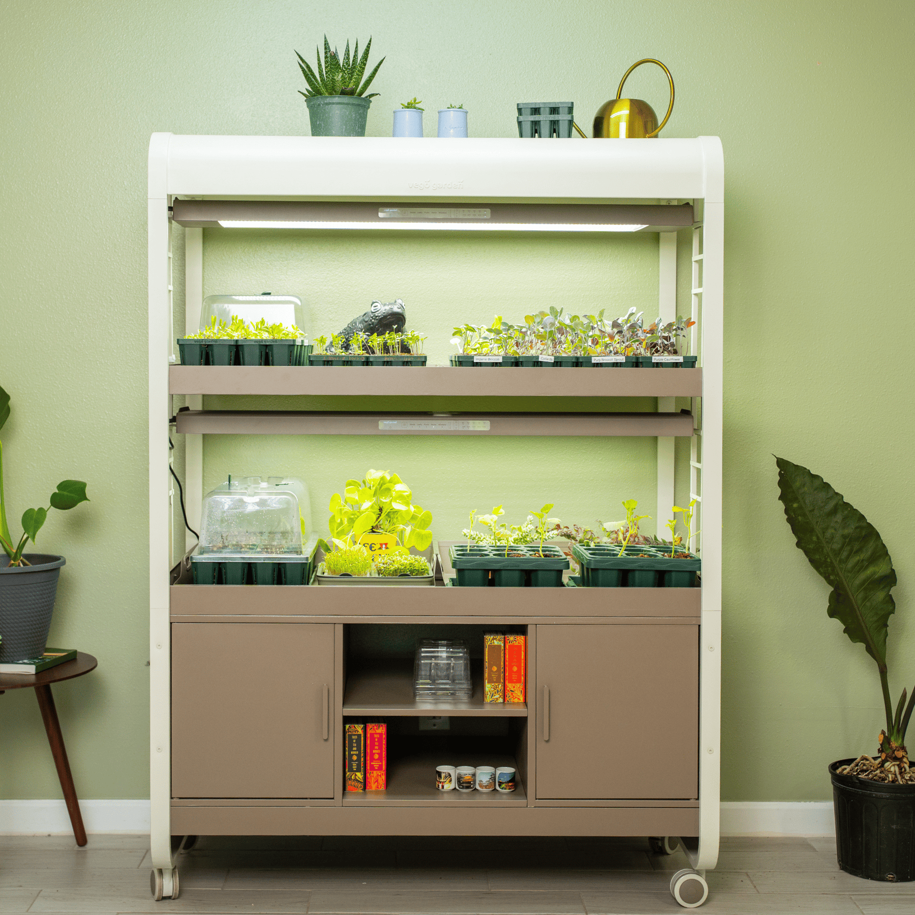 The Grow Light Garden with Storage includes a built-in cabinet for organizing tools, trays, and accessories, while the standard version focuses on a lighter frame for easy mobility and an additional Ultimate Grow Light .
