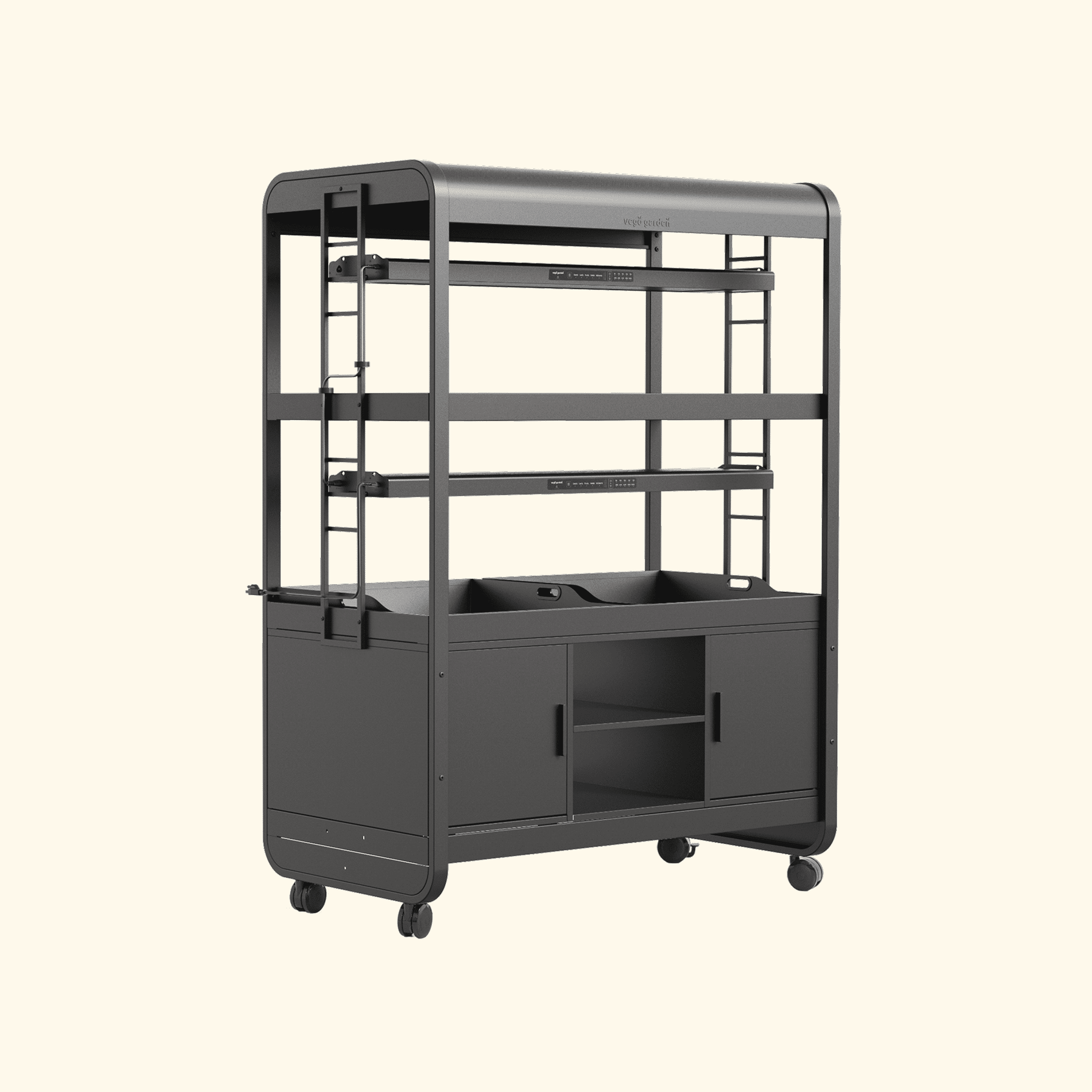 The bottom tray or storage cabinet can support up to 88 lbs, while the upper trays can hold up to 66 lbs each.