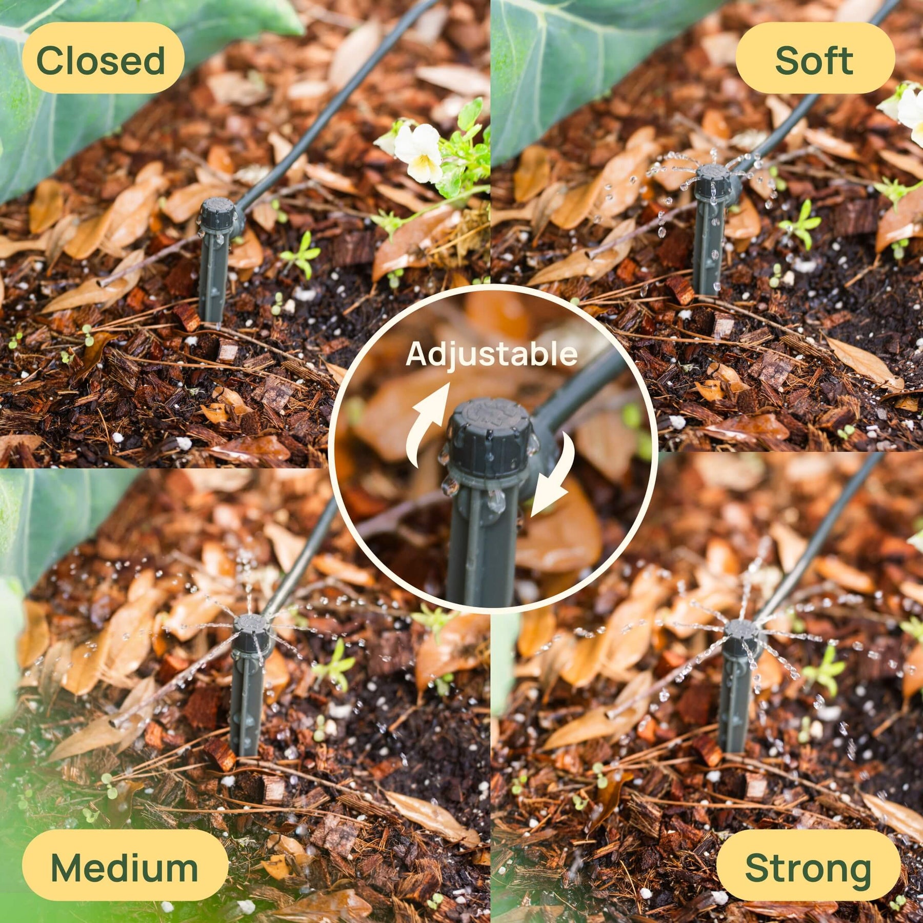 Mist Nozzles: Ideal for seedlings and most plants, providing a fine, even mist.Fountain Sprinkler: Provides extra water coverage for fruits, plants with higher water needs, and blind spots.
