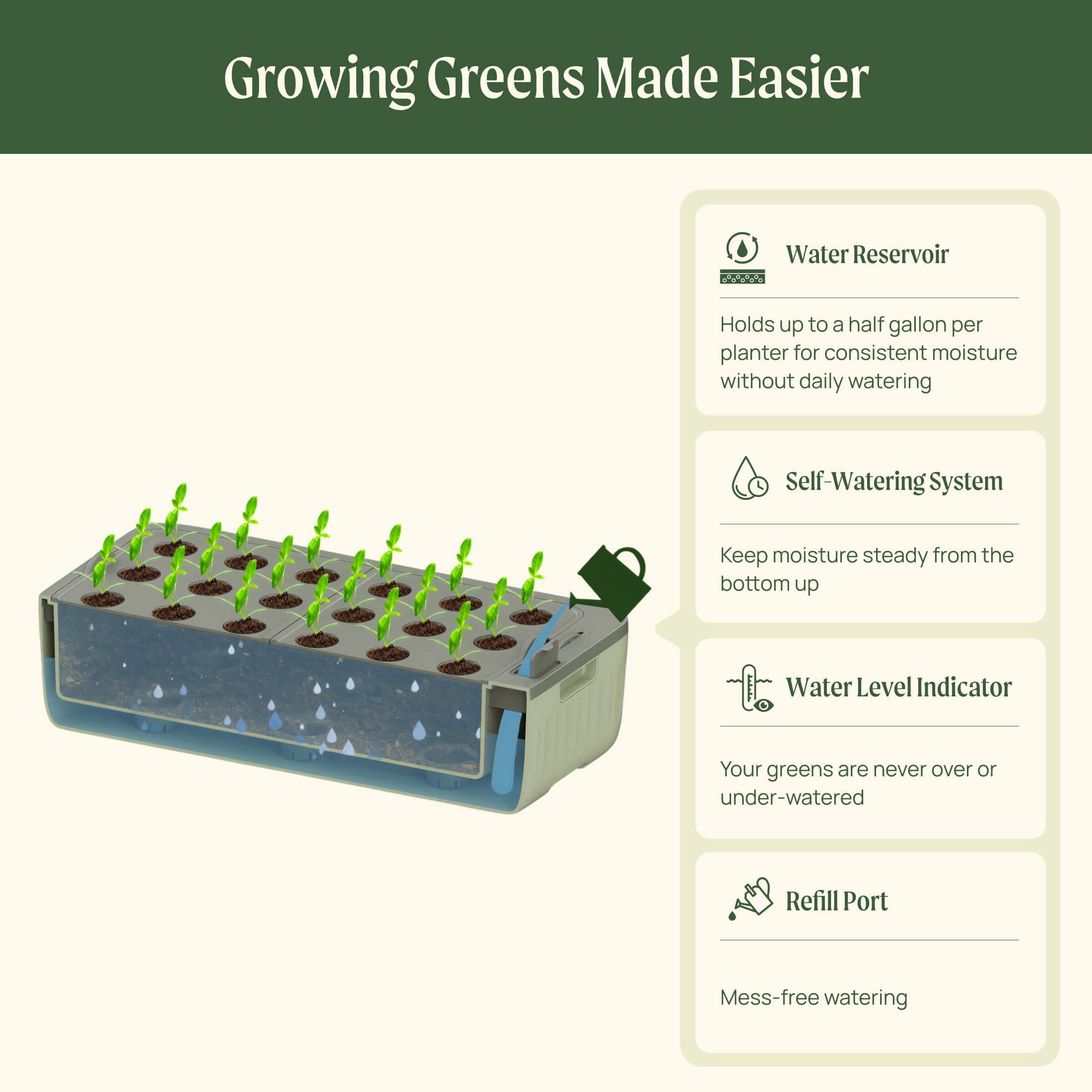 Every feature of this planter makes it easier to grow delicious greens at home. The latest self-watering
