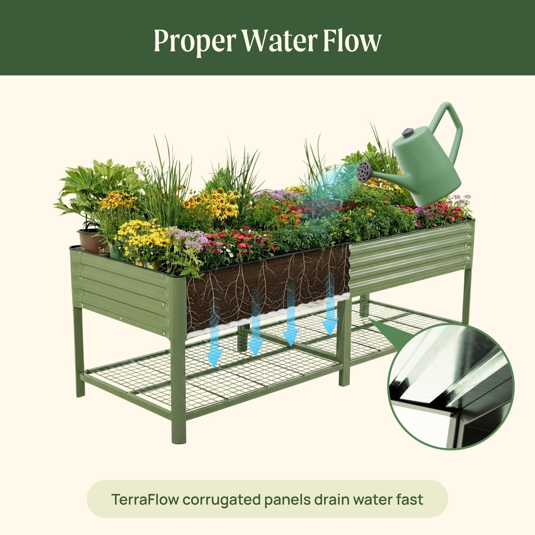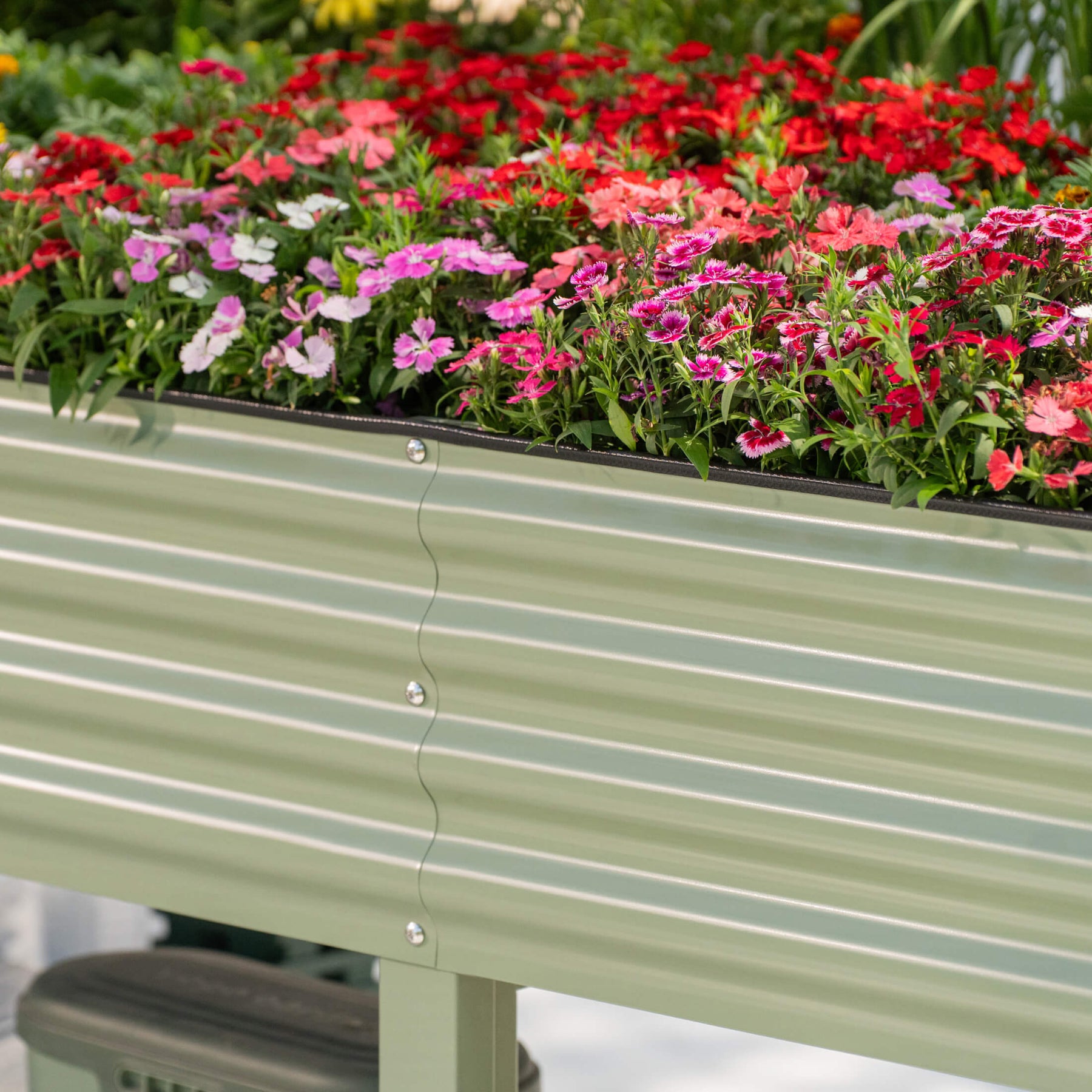 Heights: 32 in (without casters), 36 in (with casters) Soil depth: 12 in Planting area: 24 sq ft (3 × 8 ft) or 25 sq ft (2.5 × 10 ft) Material: VZ 2.0 zinc-aluminum-magnesium steel with USDA-standard powder coating Support: Integrated welded legs + reinforced metal rack (stronger 6 mm gauge for added stability)