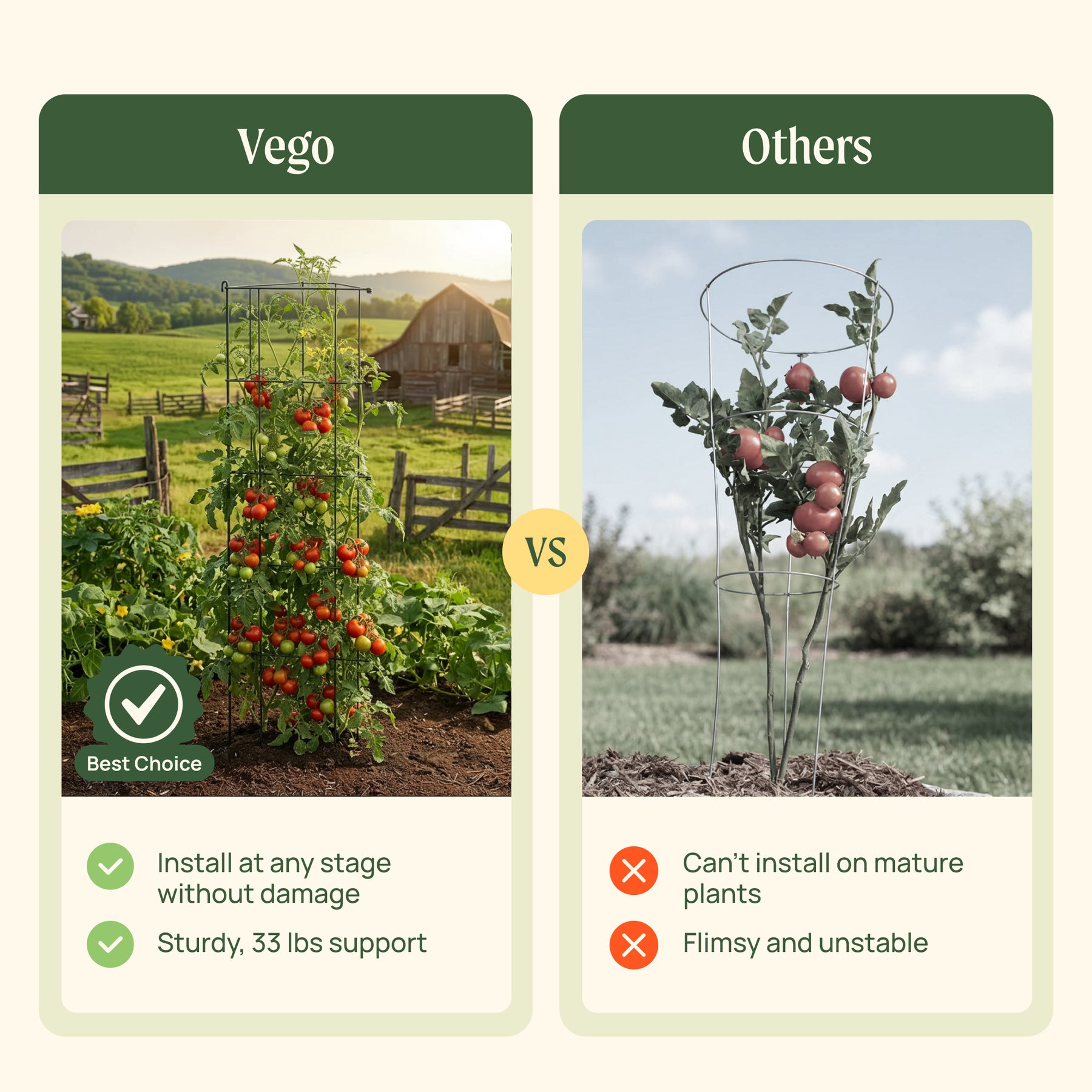 Thicker wires made of reinforced steel support up to 33 lbs, so tall vines and heavy fruit stay safely in