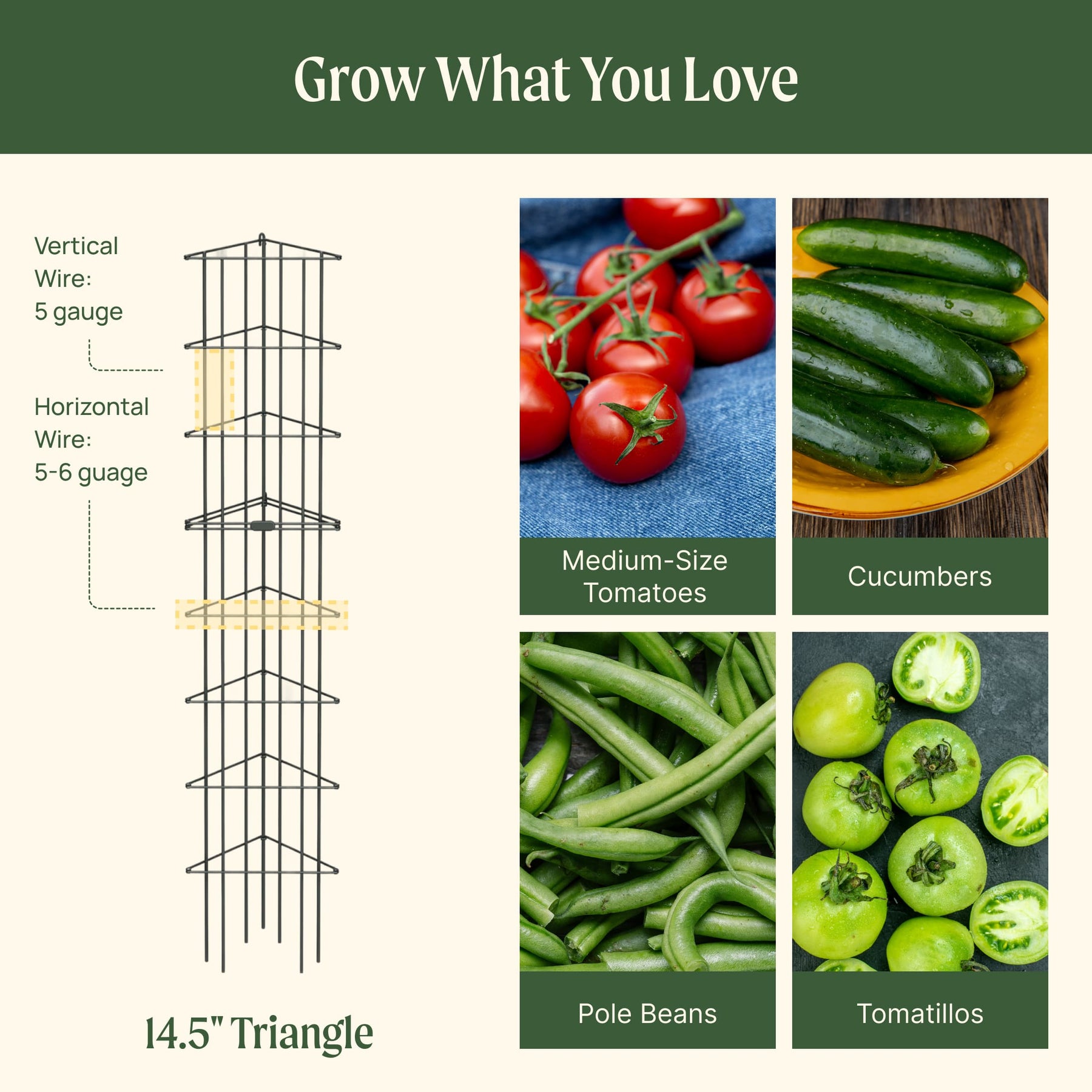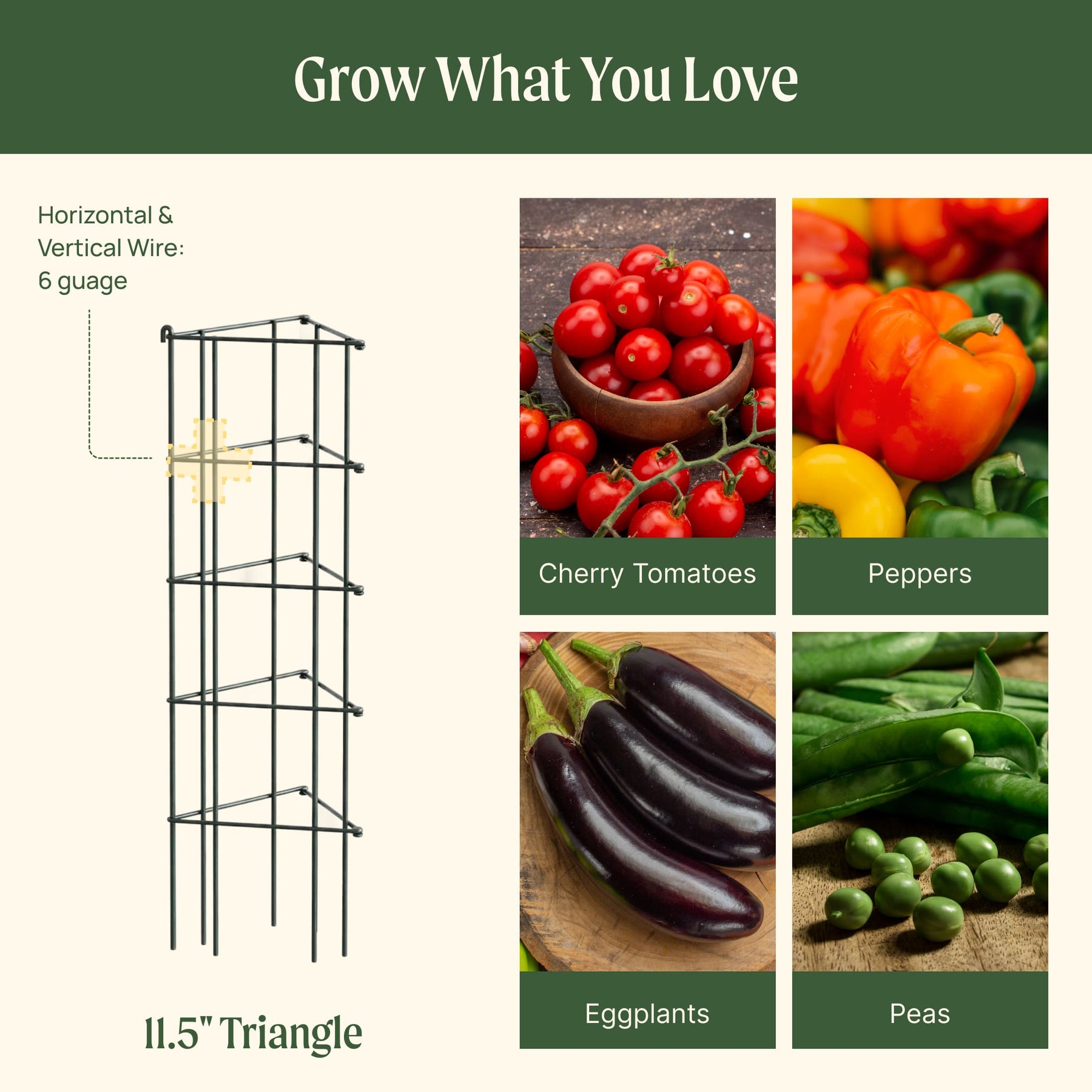 11.5" cage – Ideal for small plants such as cherry or compact tomatoes, peppers, and eggplants. Best for lighter growth and smaller spaces. 14.5" cage – A great all-around choice for most medium tomato varieties, beans, offering dependable support throughout the season. 16.5" cage – Designed for large, vigorous plants, including indeterminate (vining) tomatoes that keep growing taller and heavier over time.