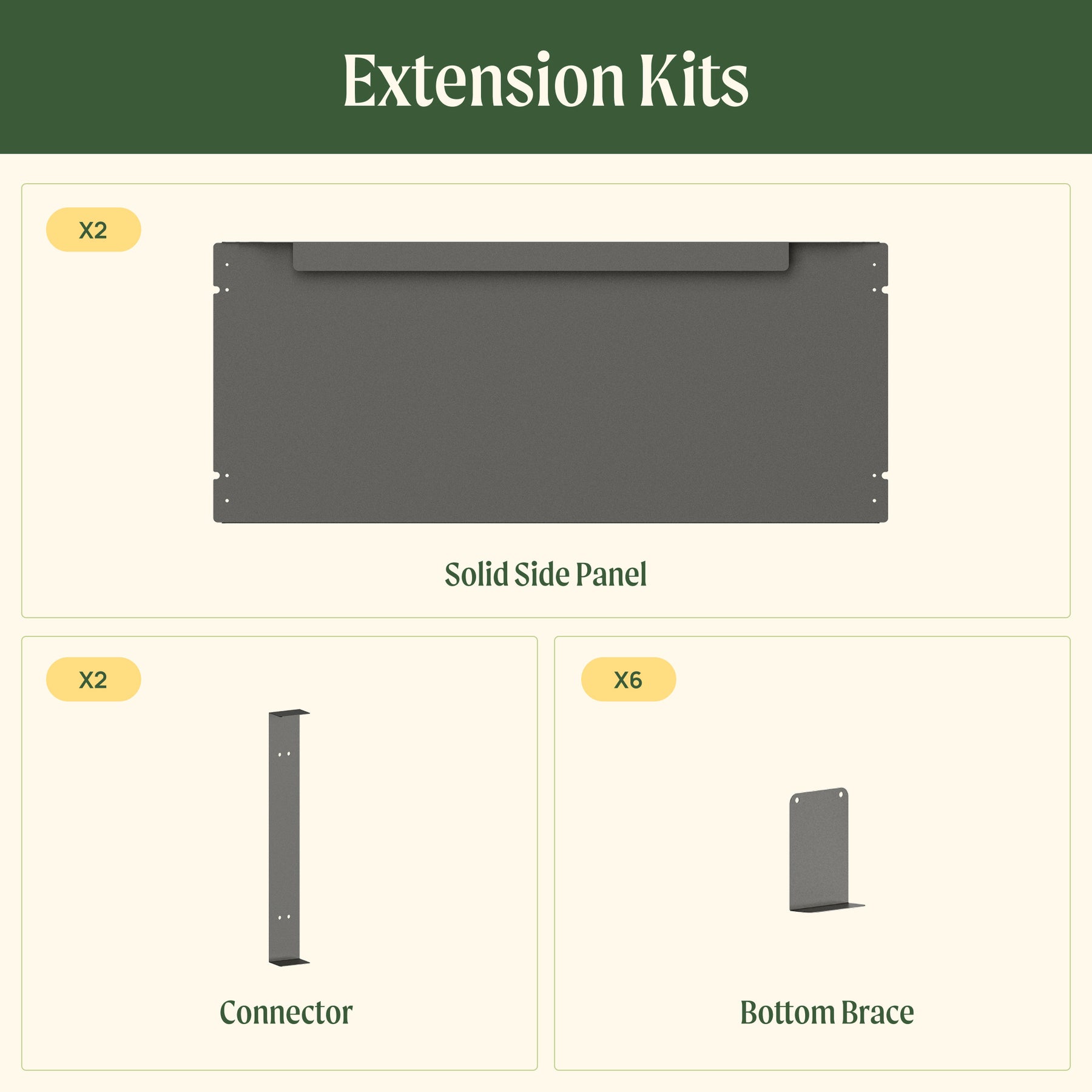 When Foodcubes are connected using Foodcube™ Couplings, start with one Side Panels Single set, then add one Extension Kit for each additional Foodcube in the row to create a seamless, modern Foodcube garden.