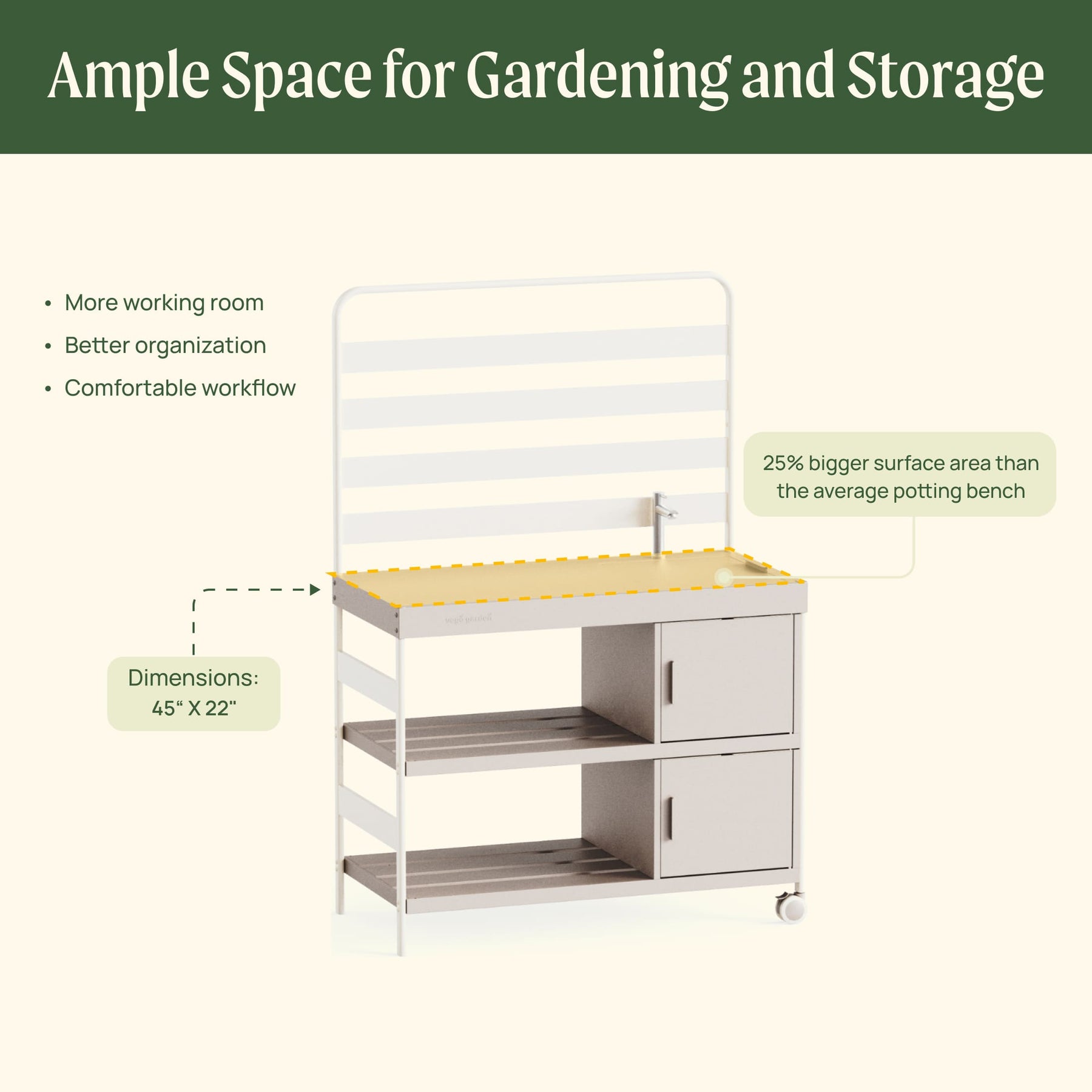 Keep your essentials right where you need them. Store soil and tools on sturdy open shelves, tuck clutter away in cabinets, and hang smaller items from the built-in rack for a setup that stays neat and ready for action.