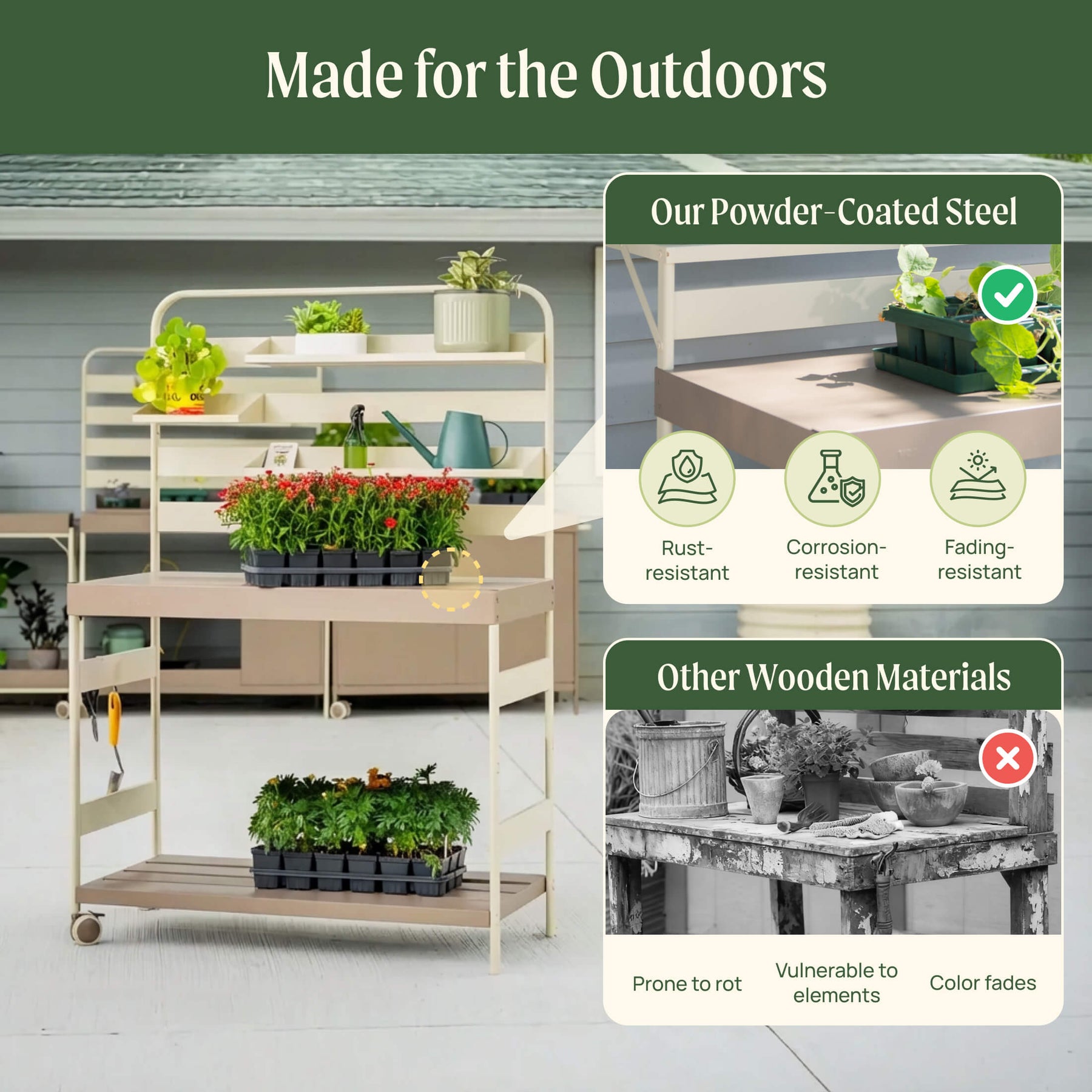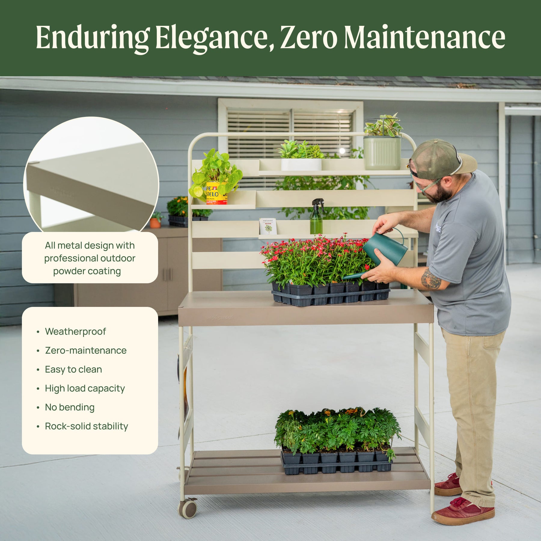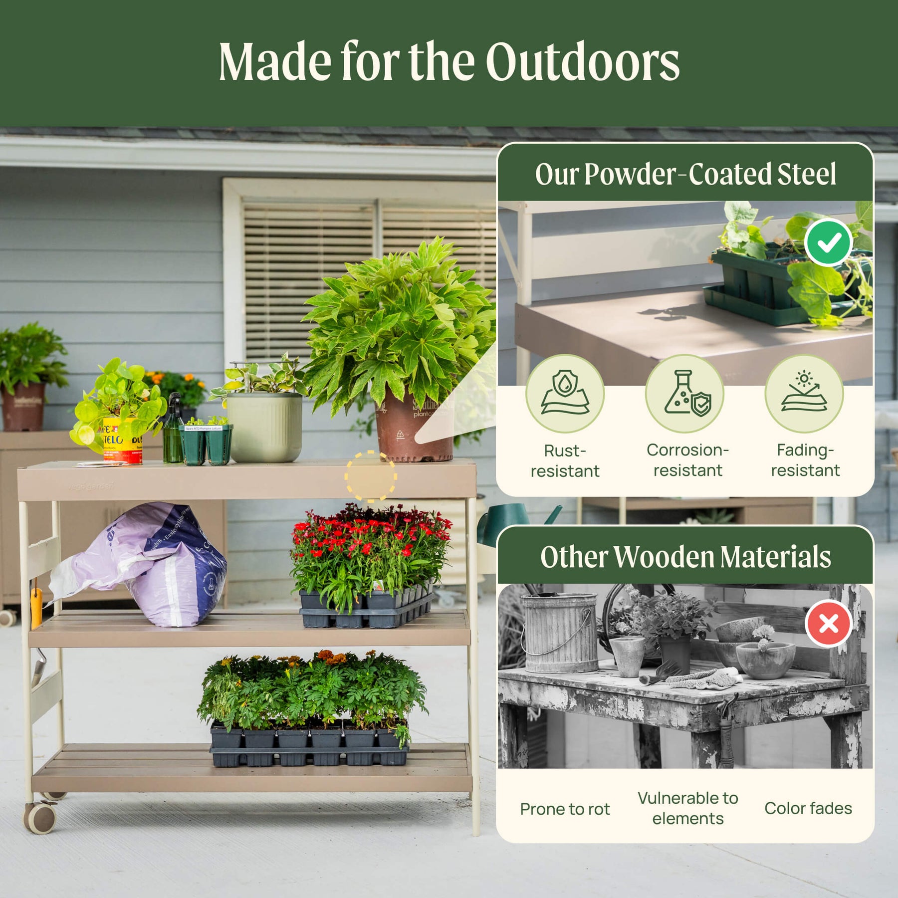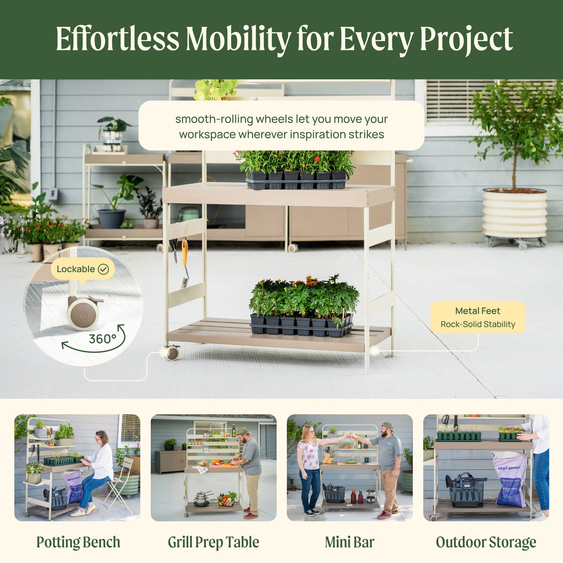 By day, it's your garden's command center, making potting, planting, and prepping effortless. By night, it becomes the perfect spot for entertaining—an outdoor buffet, drink station, or prep surface that lets you host with ease.