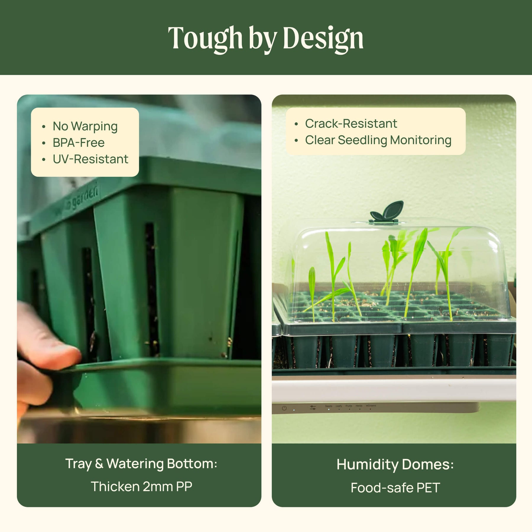 The Seedling Trays and Bottom Watering Trays are made from thick, BPA-free polypropylene with UV stabilizers to prevent warping, while the Humidity Domes are crafted from food-safe PET that stays clear and crack-resistant.