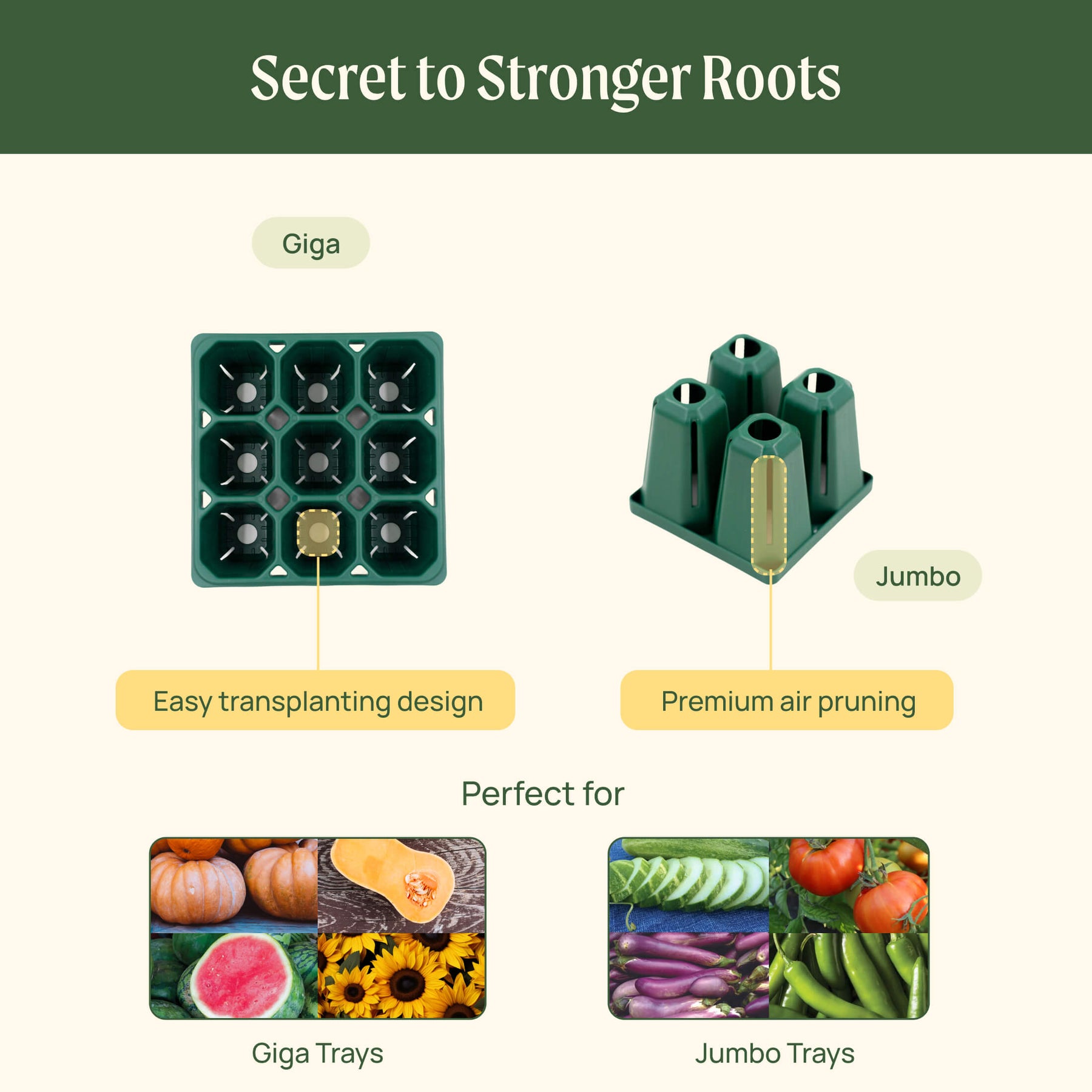 While standard trays can cramp roots and stunt growth, both our Jumbo and Giga trays