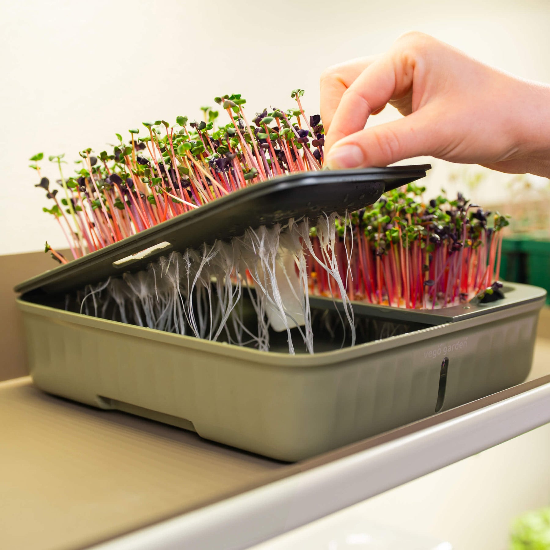 In just 7-10 days, your nutrient-rich microgreens are ready. Snip them with scissors and toss the entire used mat in the compost.