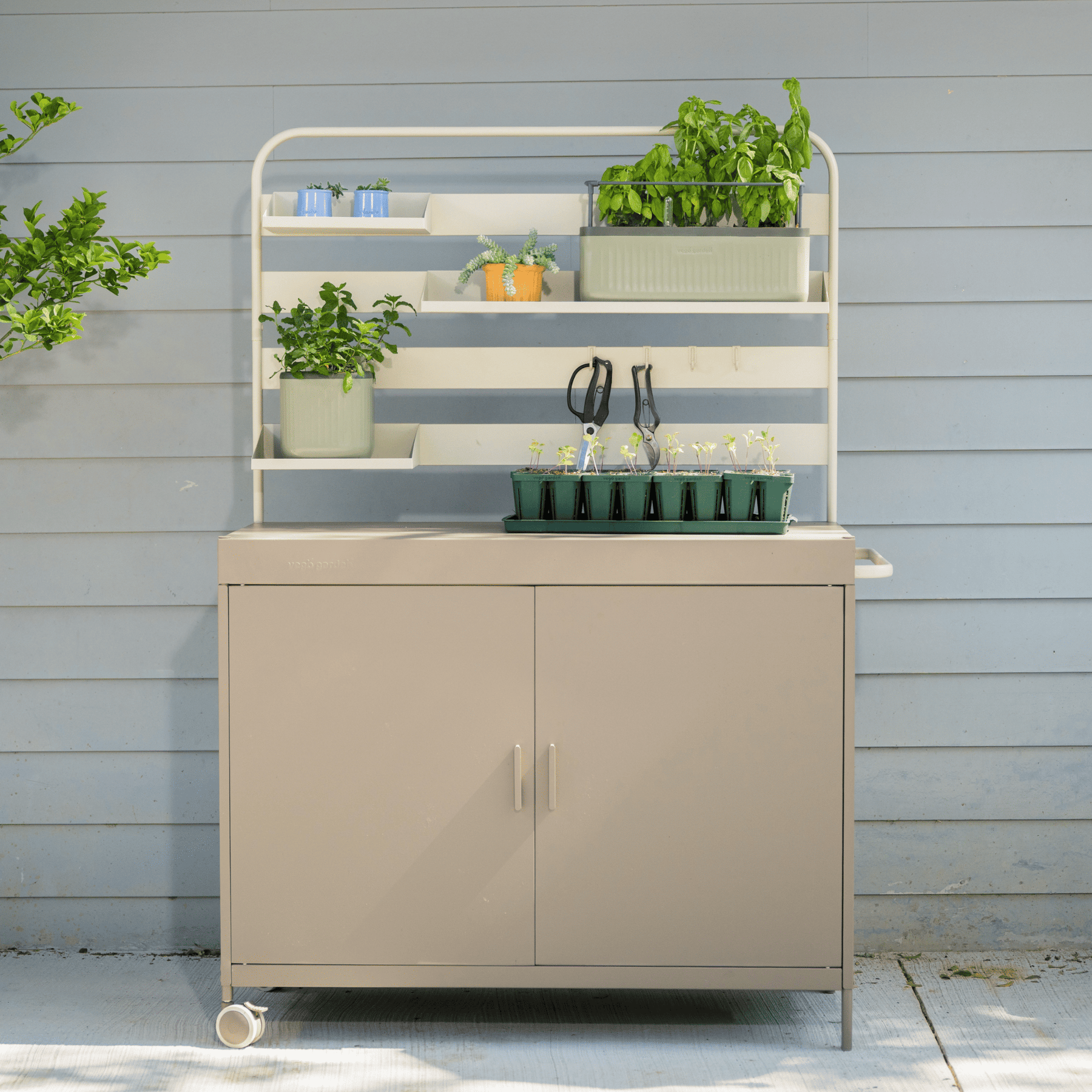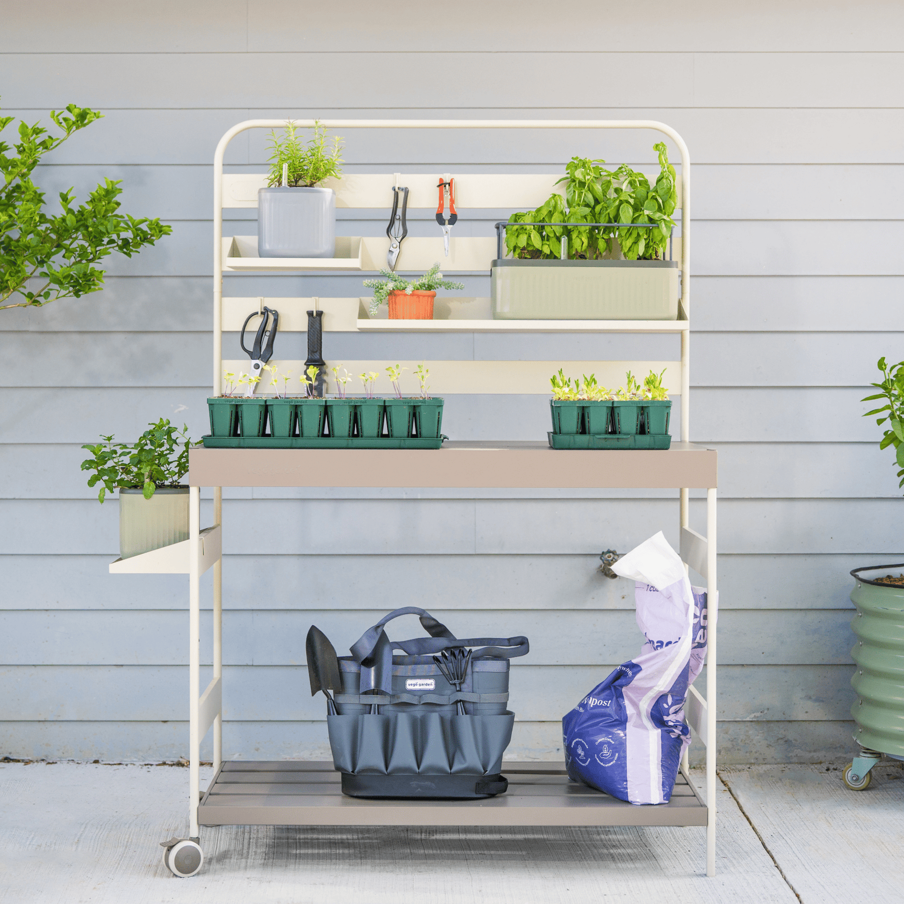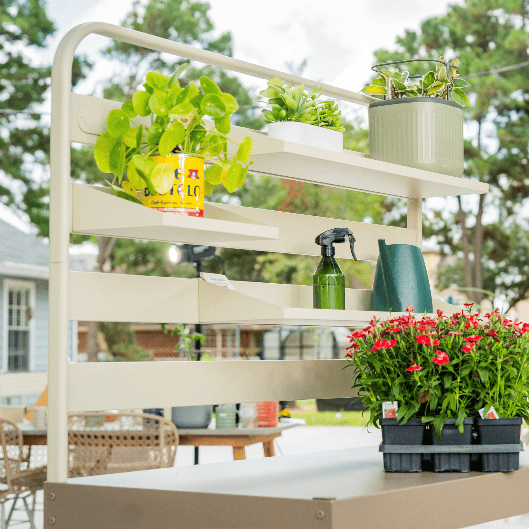 A spacious, all-metal bench built for potting, prep, and daily garden projects. Open shelving keeps tools within reach, and lockable wheels let you move it wherever you need.