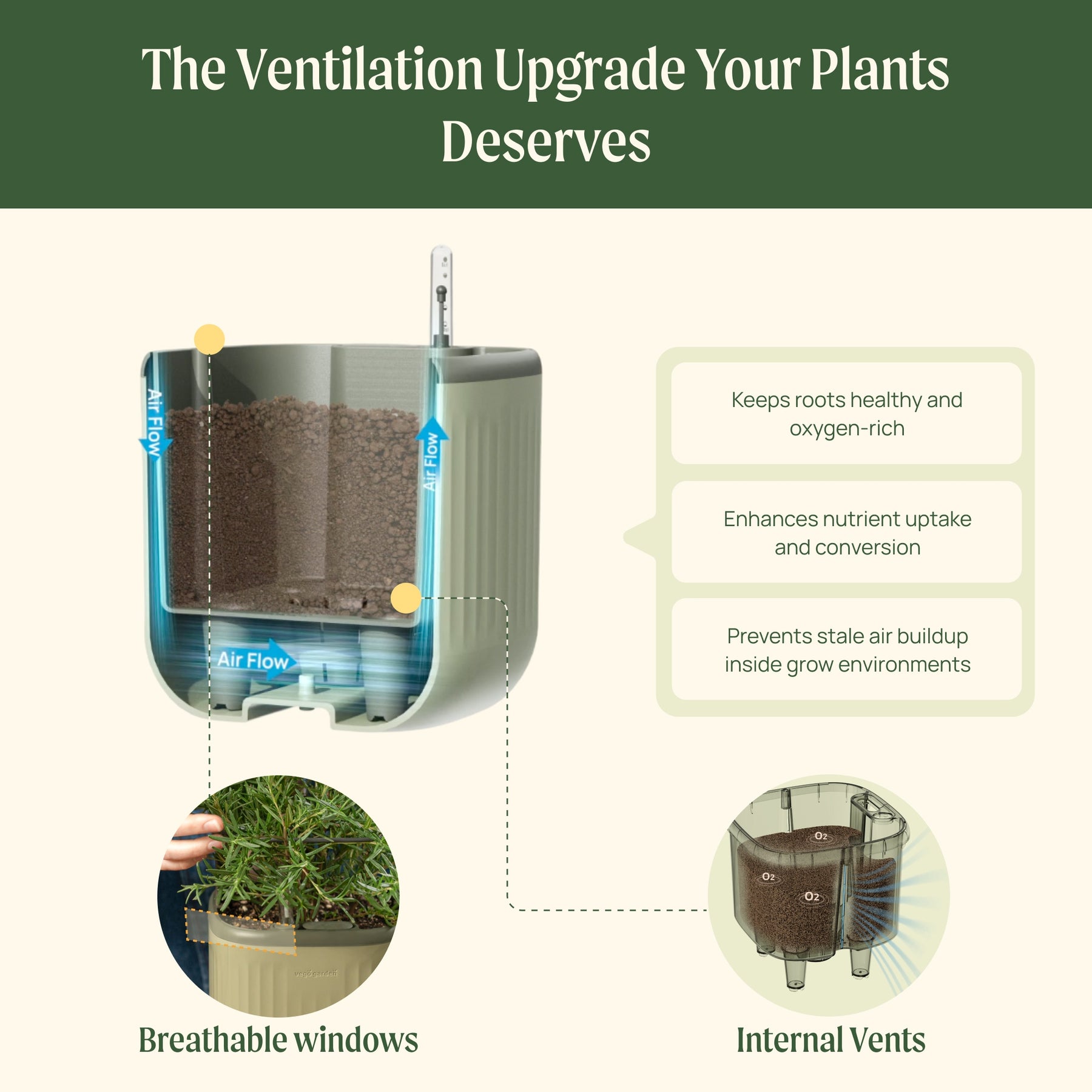 Breathable windows on the inner planter ensure proper