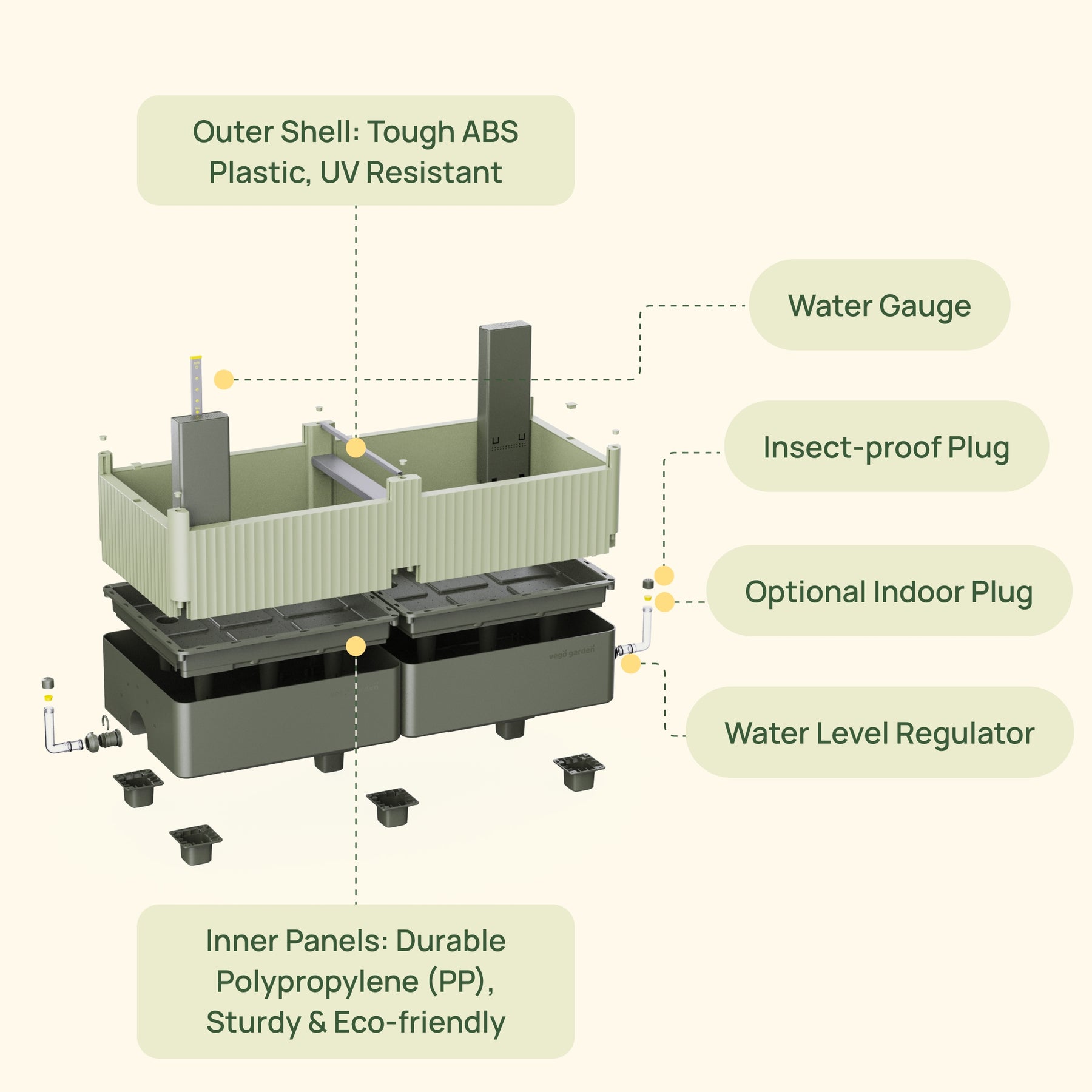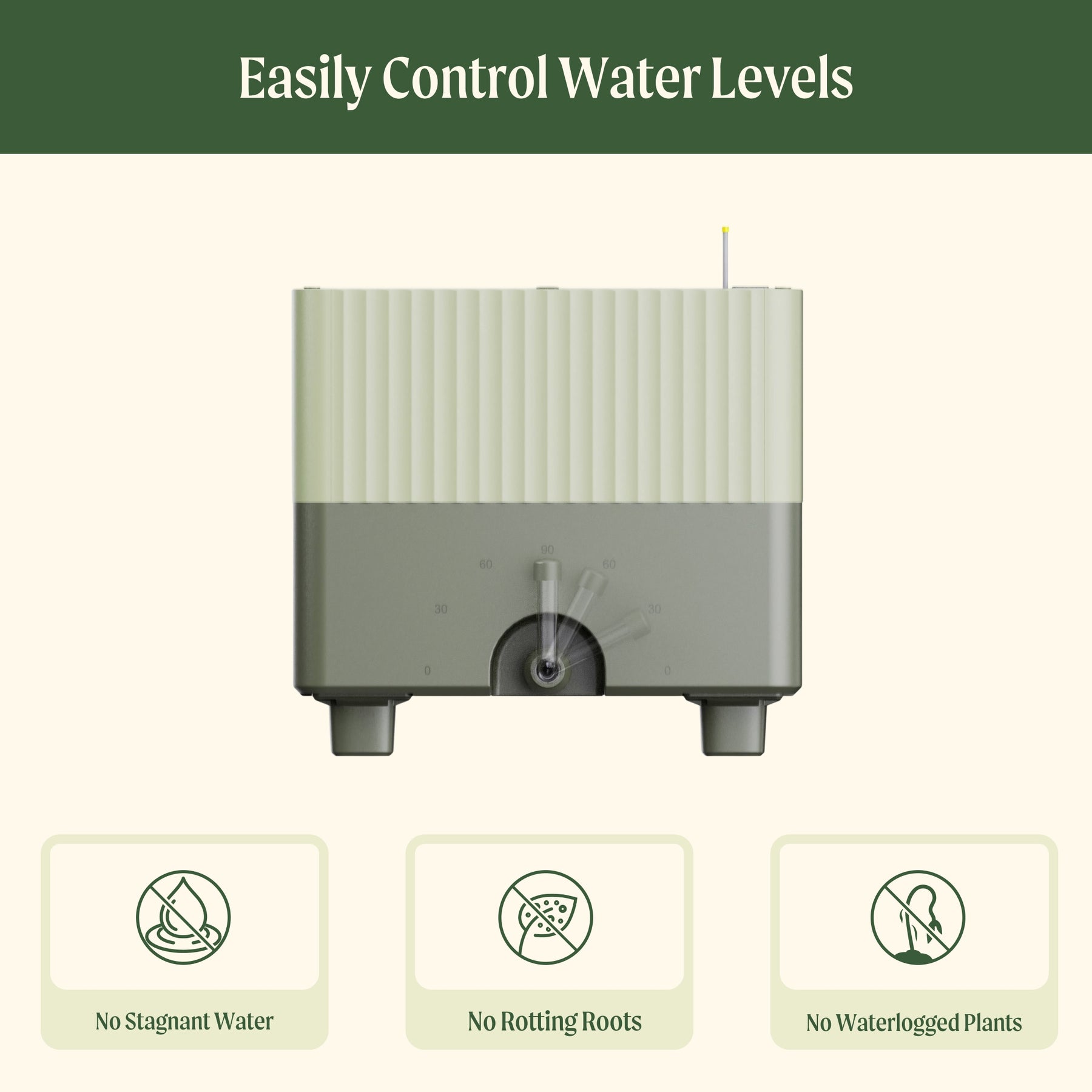 Adjust the water levels easily to suit your plants' needs and prevent waterlogging. It keeps roots from soaking in standing water, creating a healthier growing space. Then our capillary tubes carry water to your plants as they need it, creating ideal conditions for healthy growth - no more rotting roots or dry dead plants.