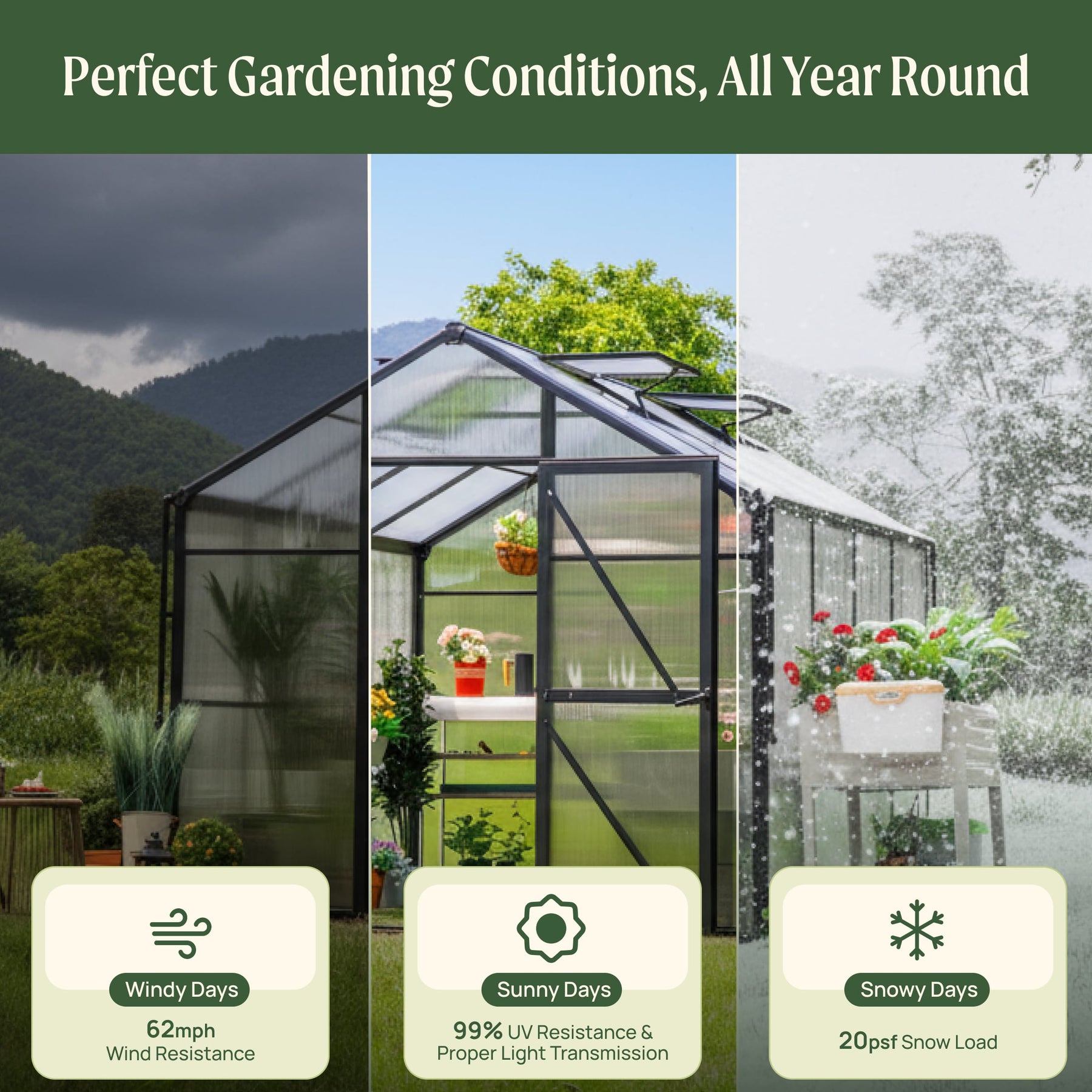 62 mph wind resistance protects plants from storms, while 20 psf snow load capacity prevents roof collapse under heavy snow, keeping crops safe
