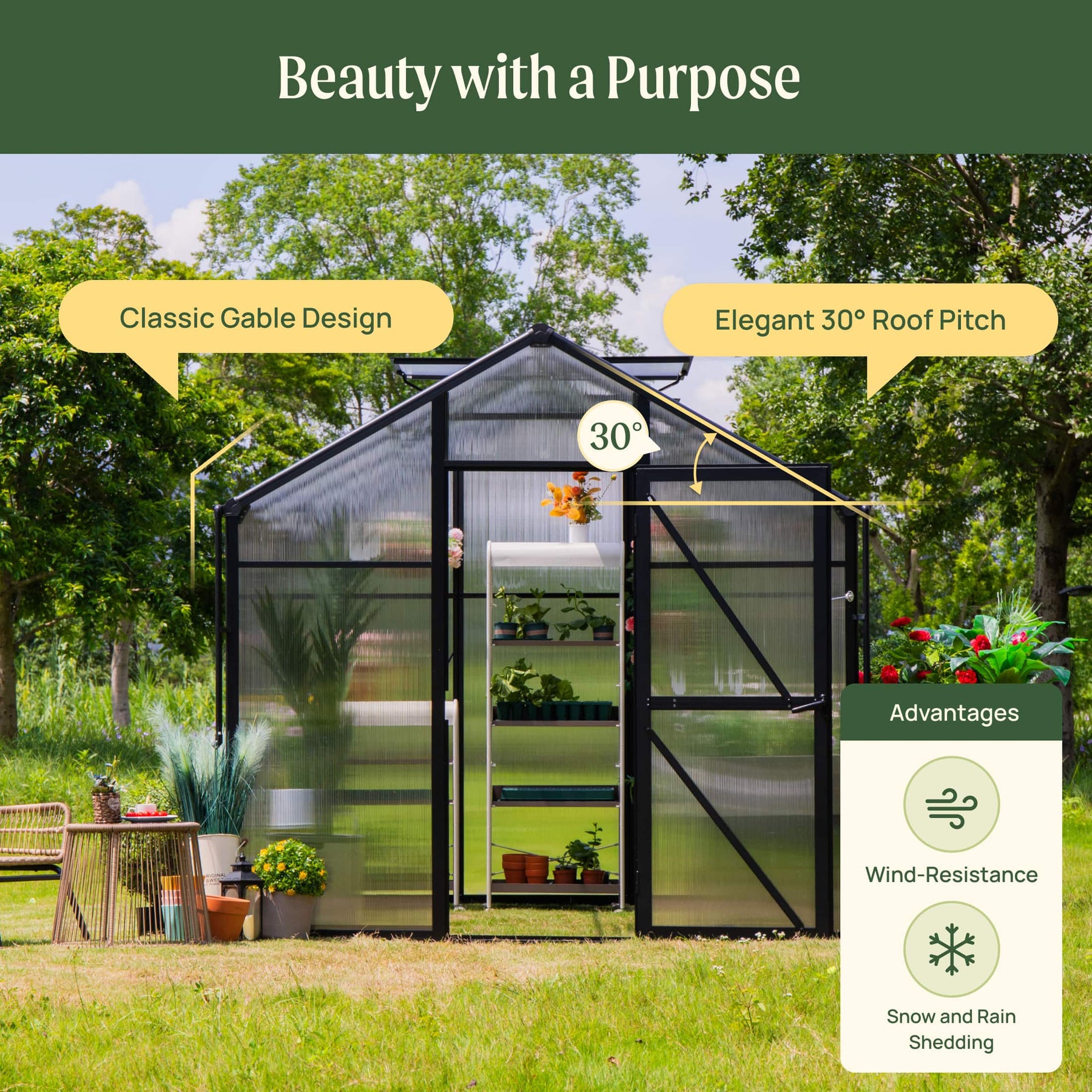 This elegant design isn’t just for show! The 30° roof angle lets snow and rain slide right off and protects your greenhouse from harsh winds.