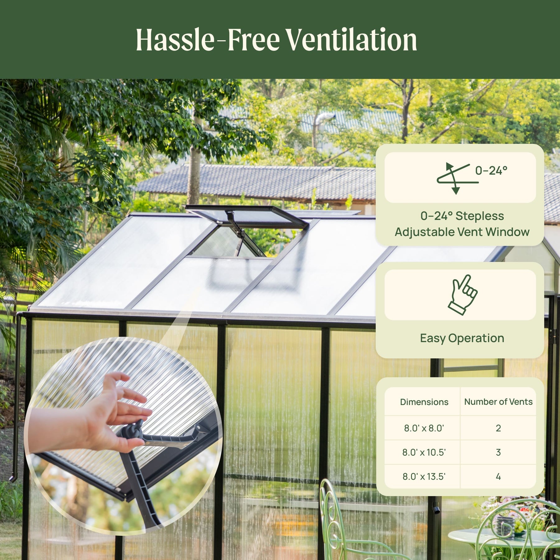 Managing your greenhouse's airflow shouldn’t be a struggle. Easy-to-open vents can be operated with one hand, leaving your other hand free to hold a ladder, carry tools, or let a little bird perch on your finger like a cartoon princess.